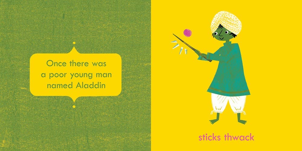 A feast for little eyes and ears. With this Aladdin and the Wonderful Lamp sounds primer, brainy babies will love hearing the whoosh of a jinni, the rustle of a magician’s robes, the tinkle of jewels in a cave of treasures, and much more.