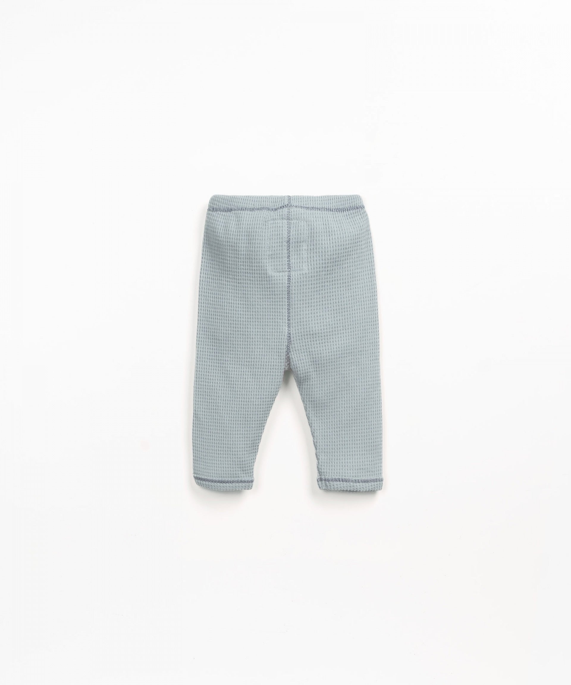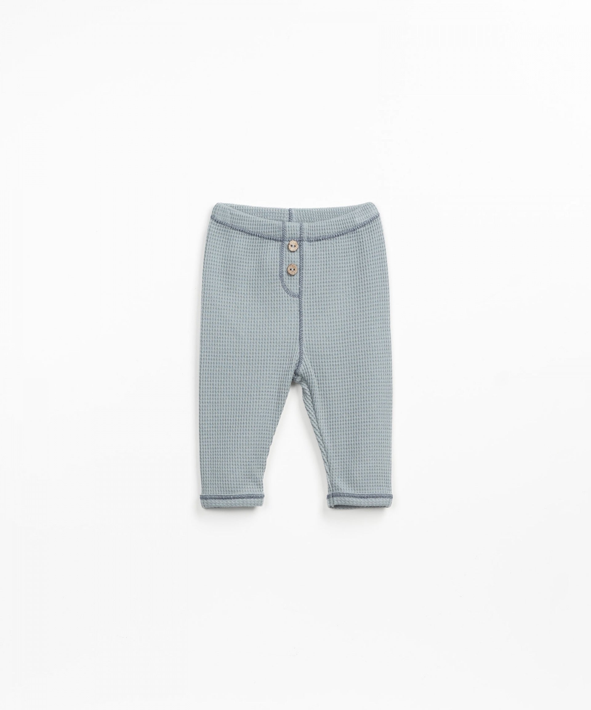 These jersey pants are made from a mixture of organic cotton and hemp, Elephant color. The model has an elastic waist, decorative coconut buttons and detail of seams contrasting.
