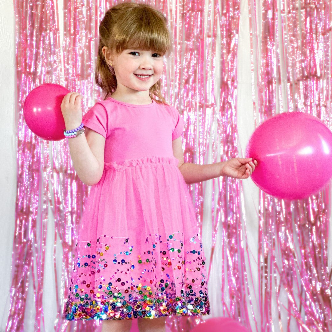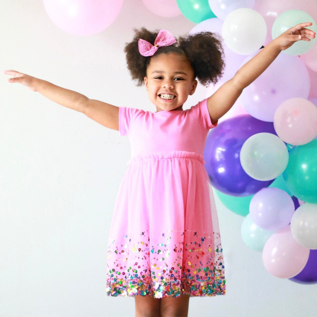 The Raspberry Confetti Short Sleeve Tutu Dress is the perfect twirl-worthy dress for celebrating birthdays, holidays or any day!