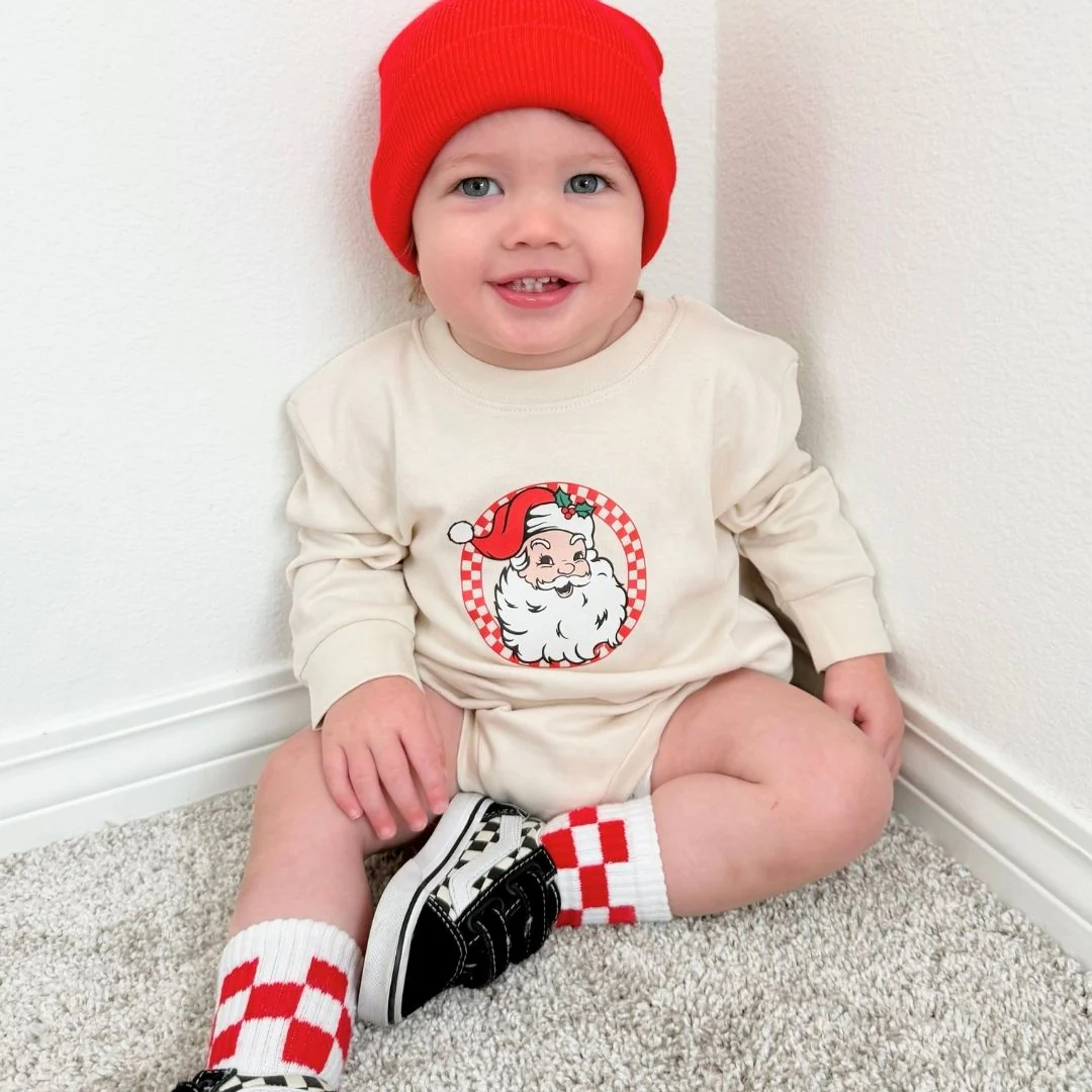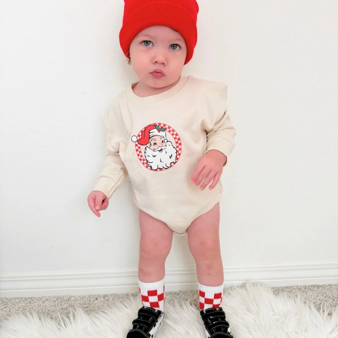 The Retro Santa Christmas Long Sleeve Romper is a fun and festive romper for babies celebrating Christmas!