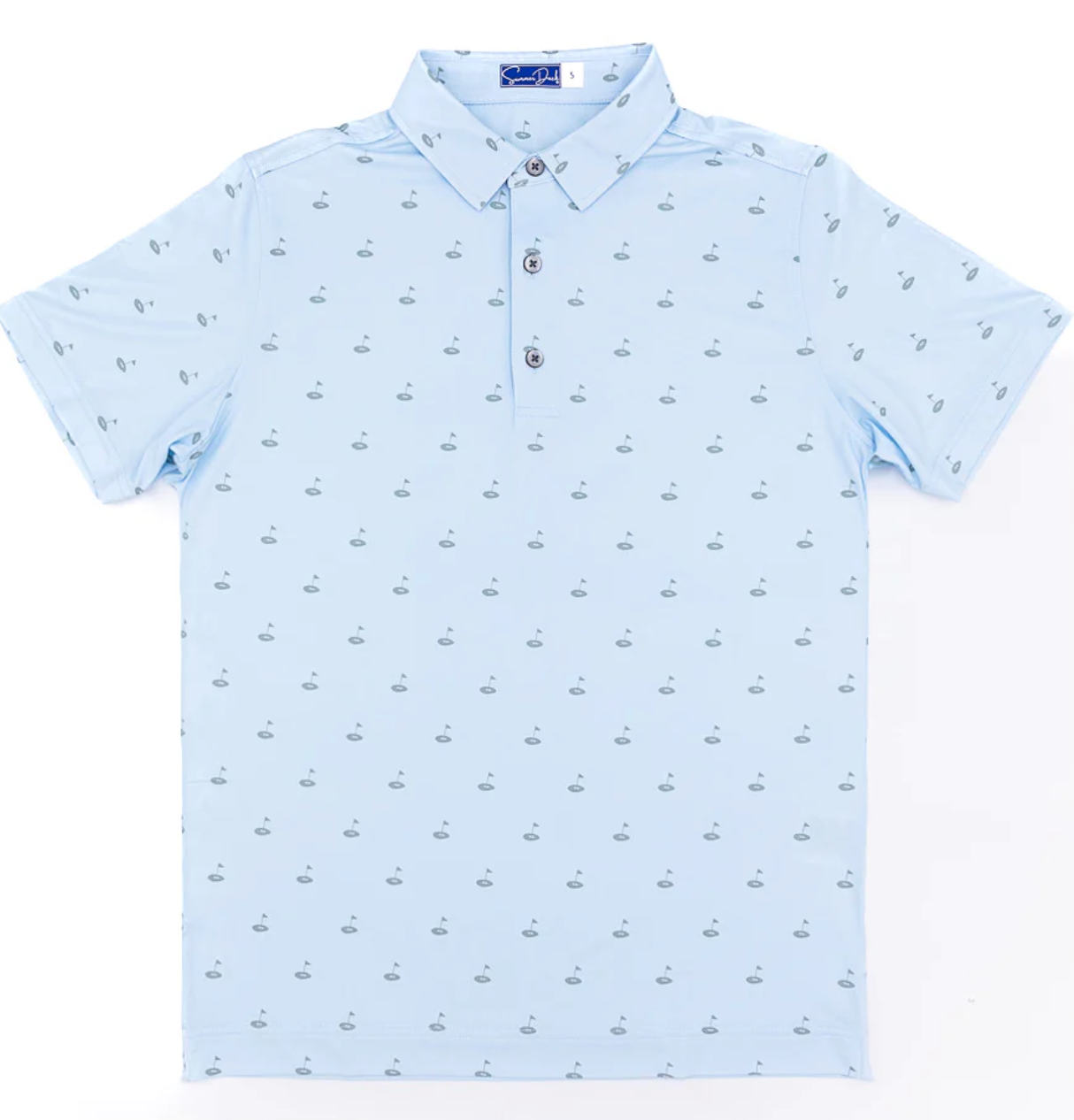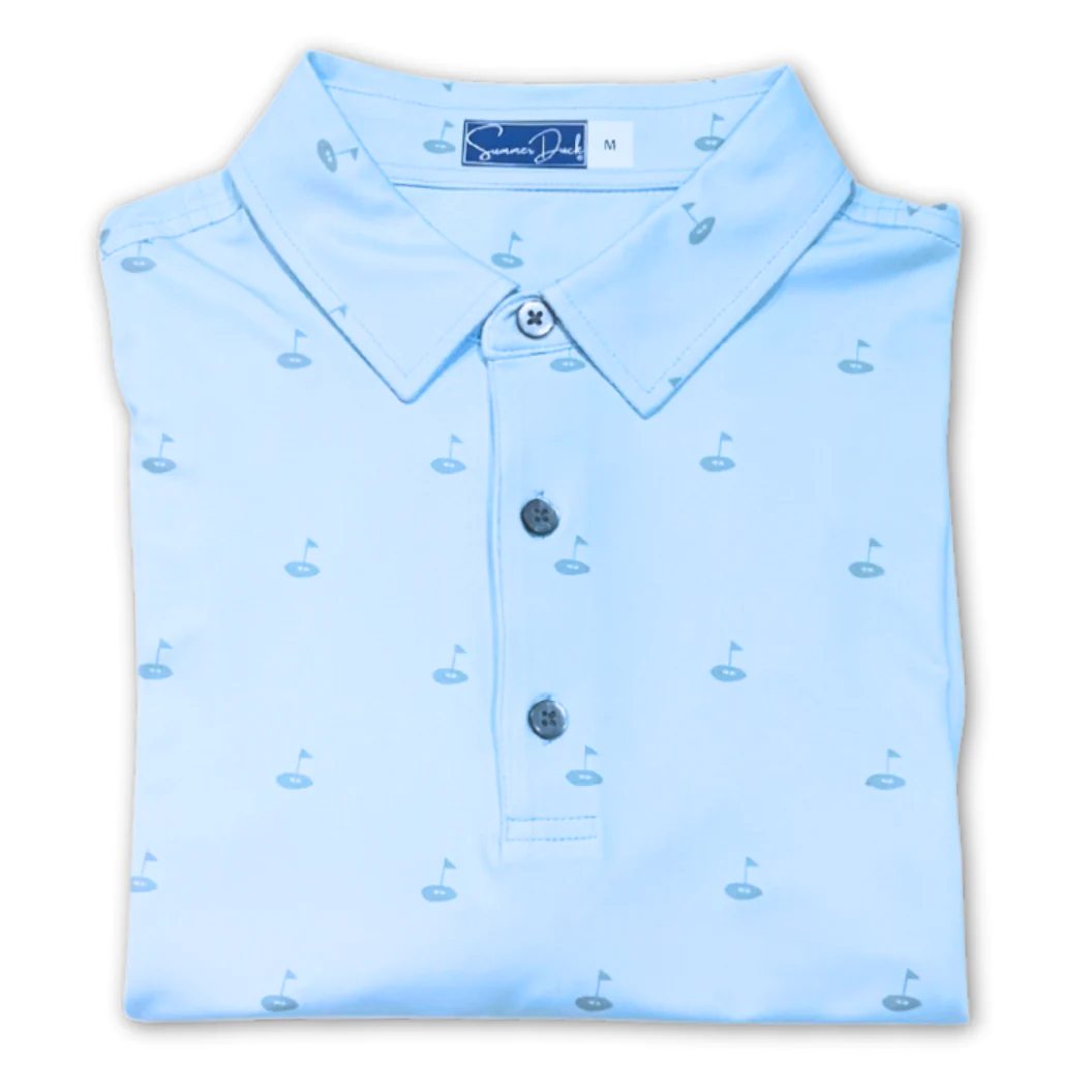 Enjoy one of our signature performance polos in style. They're made from a soft fabric that features moisture-wicking, sun protection and easy-care, with four-way stretch for comfort that last all day. This polo features a custom-designed golf tee print. Finished with a Sean self-fabric collar and three-button placket.