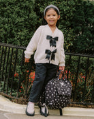 V-neck cardigan with relaxed raglan sleeves and a two-button placket accented by fixed bows for a sweet, gentle touch.
