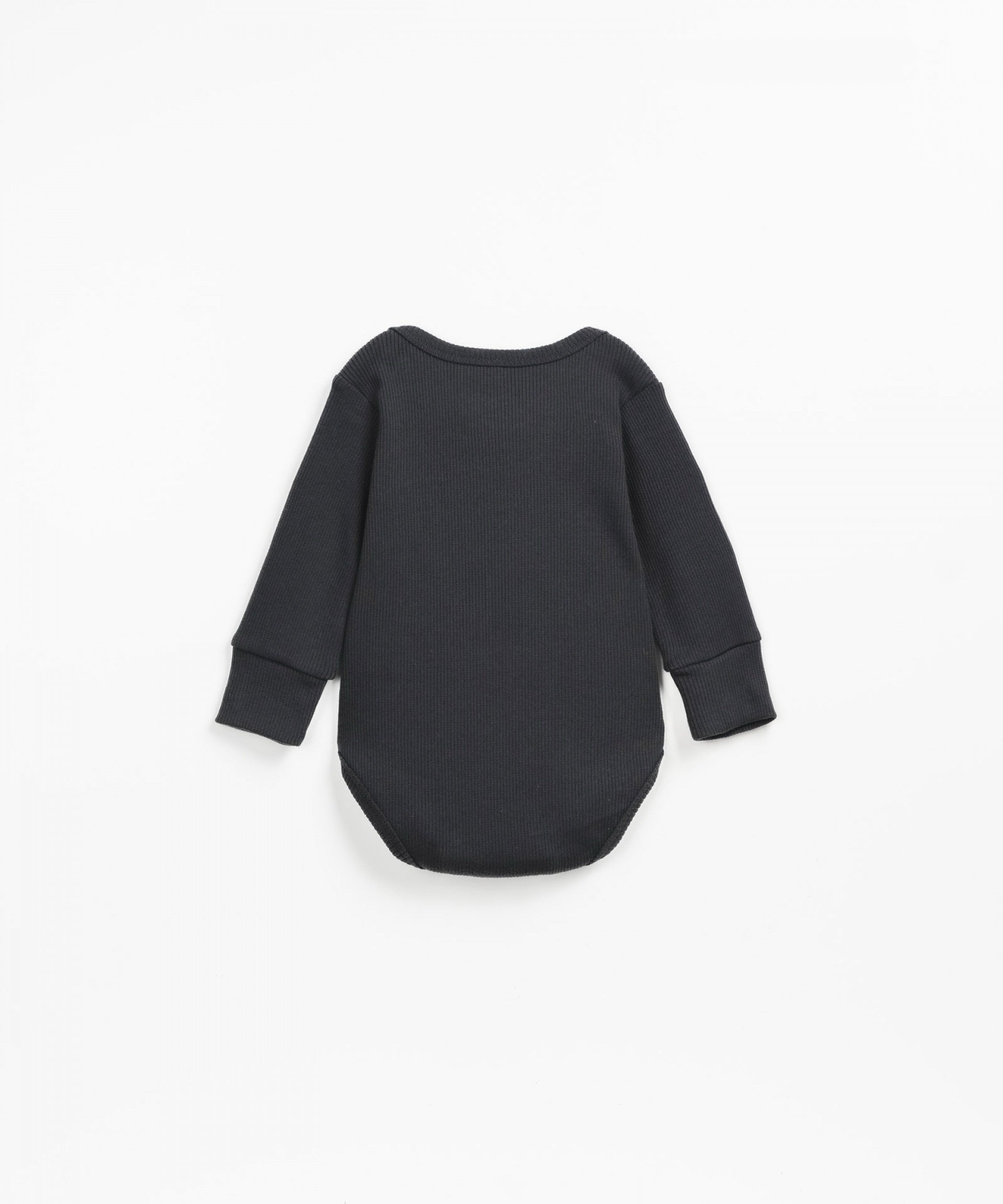 This ribbed bodysuit is made from organic cotton, Shadow color. The model has long sleeves, a round neckline, double-breasted shoulders and a crotch opening with nickel-free metal snap buttons.
