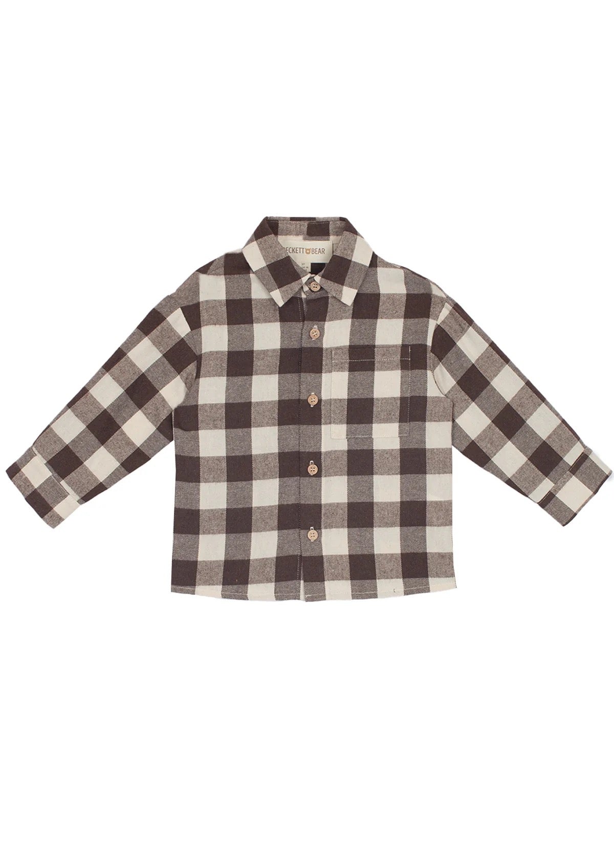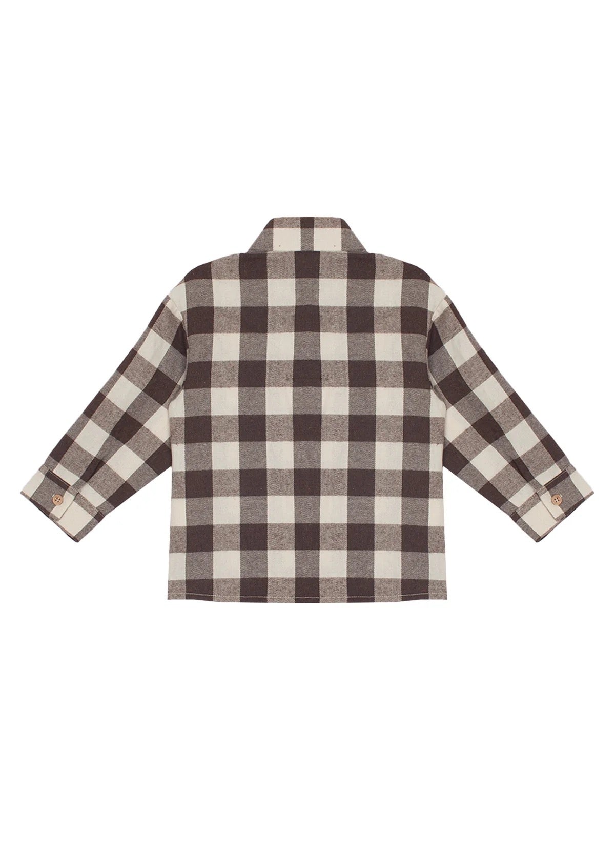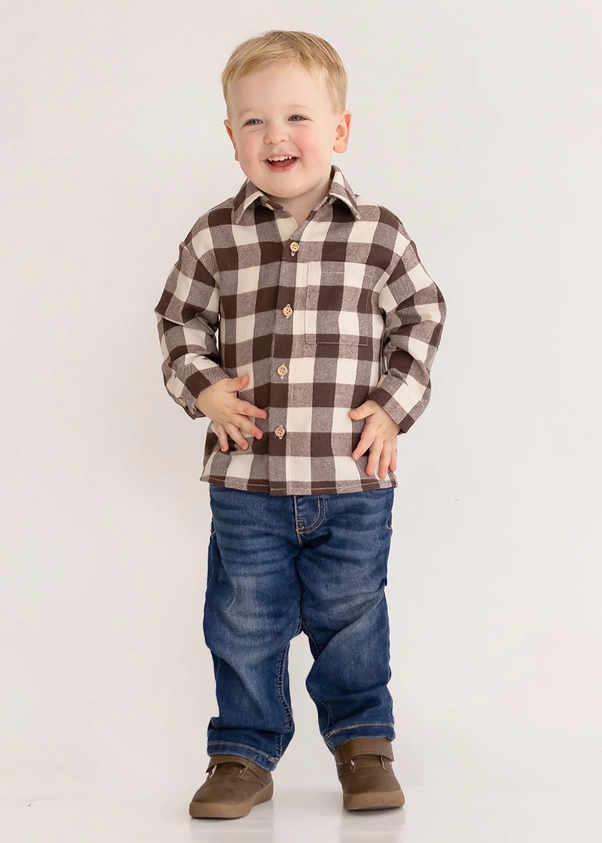 This boys' top showcases a classic check pattern in rich shades of brown and cream, offering a timeless, rugged style. The long-sleeved design is complemented by a front button closure and a chest pocket, making it a versatile addition to any little one's wardrobe for both casual and dressy occasions.