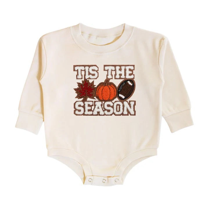 The Tis The Season Pumpkin Patch Long Sleeve Romper is a fun and cute romper for babies celebrating Fall!