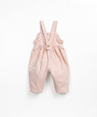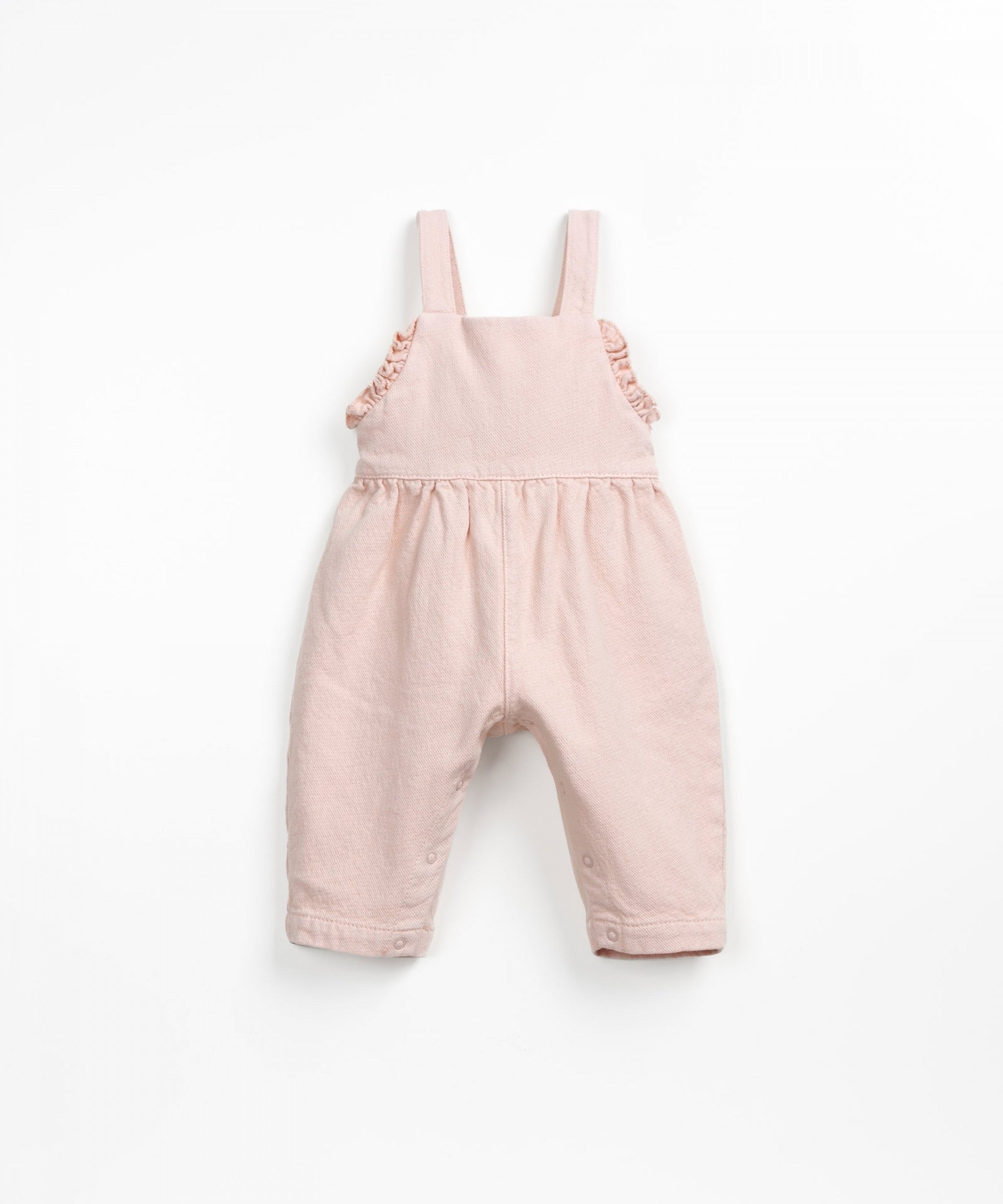 This woven jumpsuit is made from organic cotton, Memories color. The model has a square neckline and straps, an opening on the back with a coconut button, and a crotch opening with nickel-free metal snap buttons (crotch opening up to size 18M). This piece is unique and special because it was dyed using the garment dye technique. This type of dyeing is applied after the piece is made, which can result in slight color imperfections.
