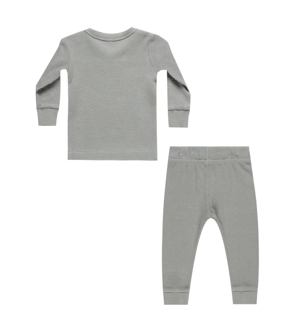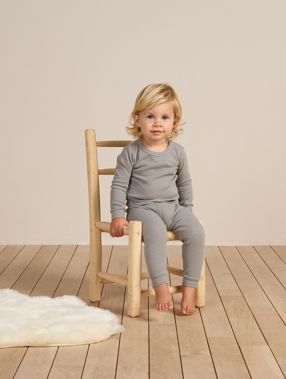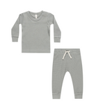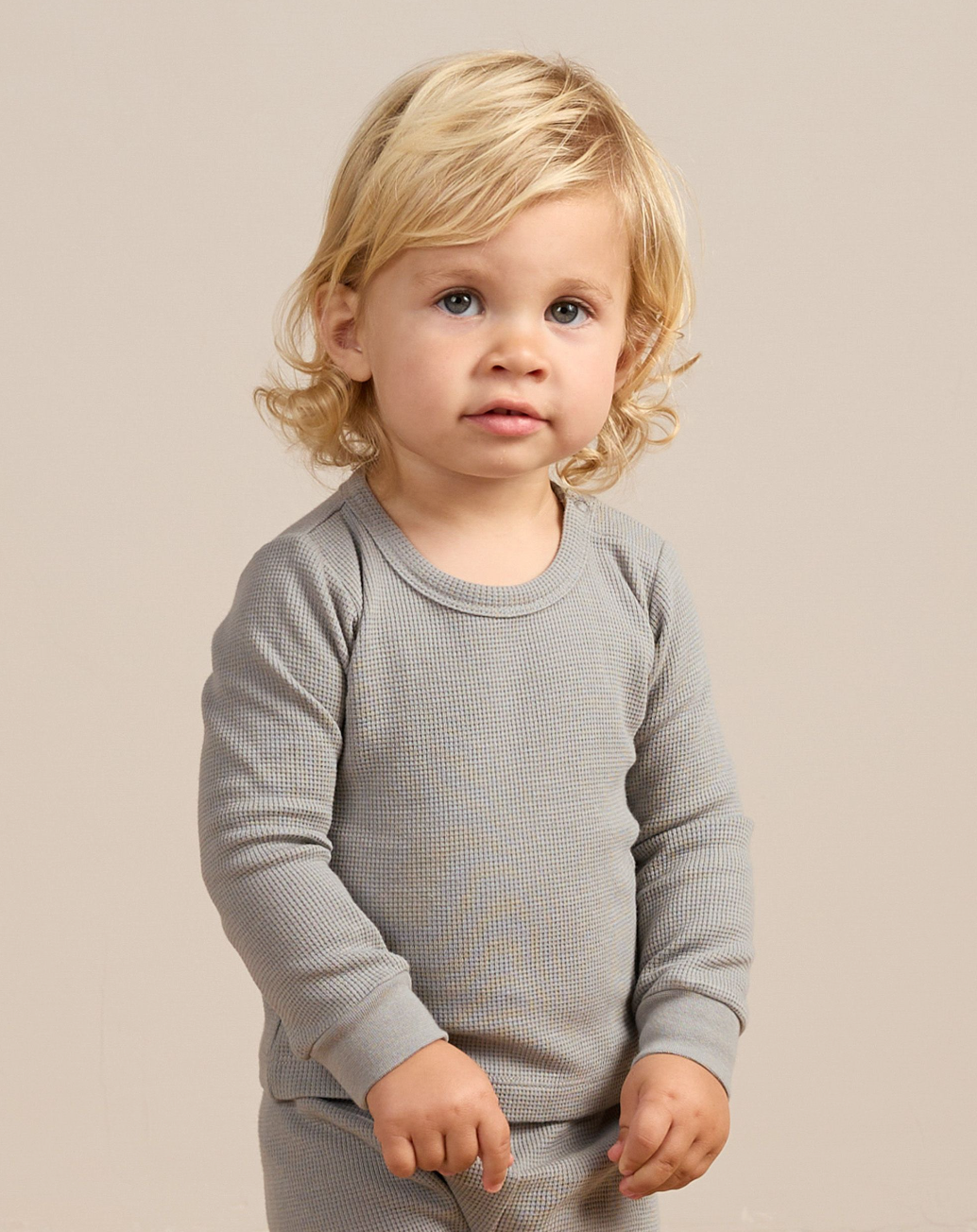 Our longsleeve top + drawstring pant set is made out of our organic cotton. Baby sizes 0-3m thru 18-24m have snaps at the shoulder for easy changing.