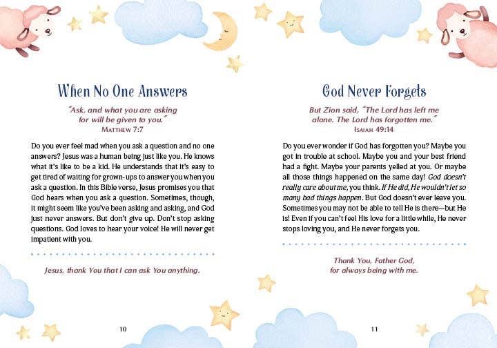 Touching on topics that are close to kids' hearts--like obedience, courage, forgiveness, joy, God's promises, love, prayer, trust, and more--let 3-Minute Bedtime Devotions for Little Hearts be the link that brings you and your kids together for some spiritual "quality time"!