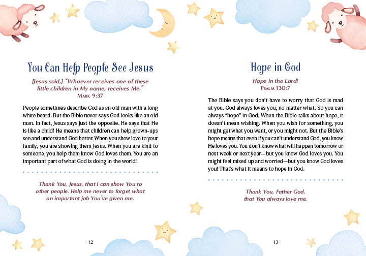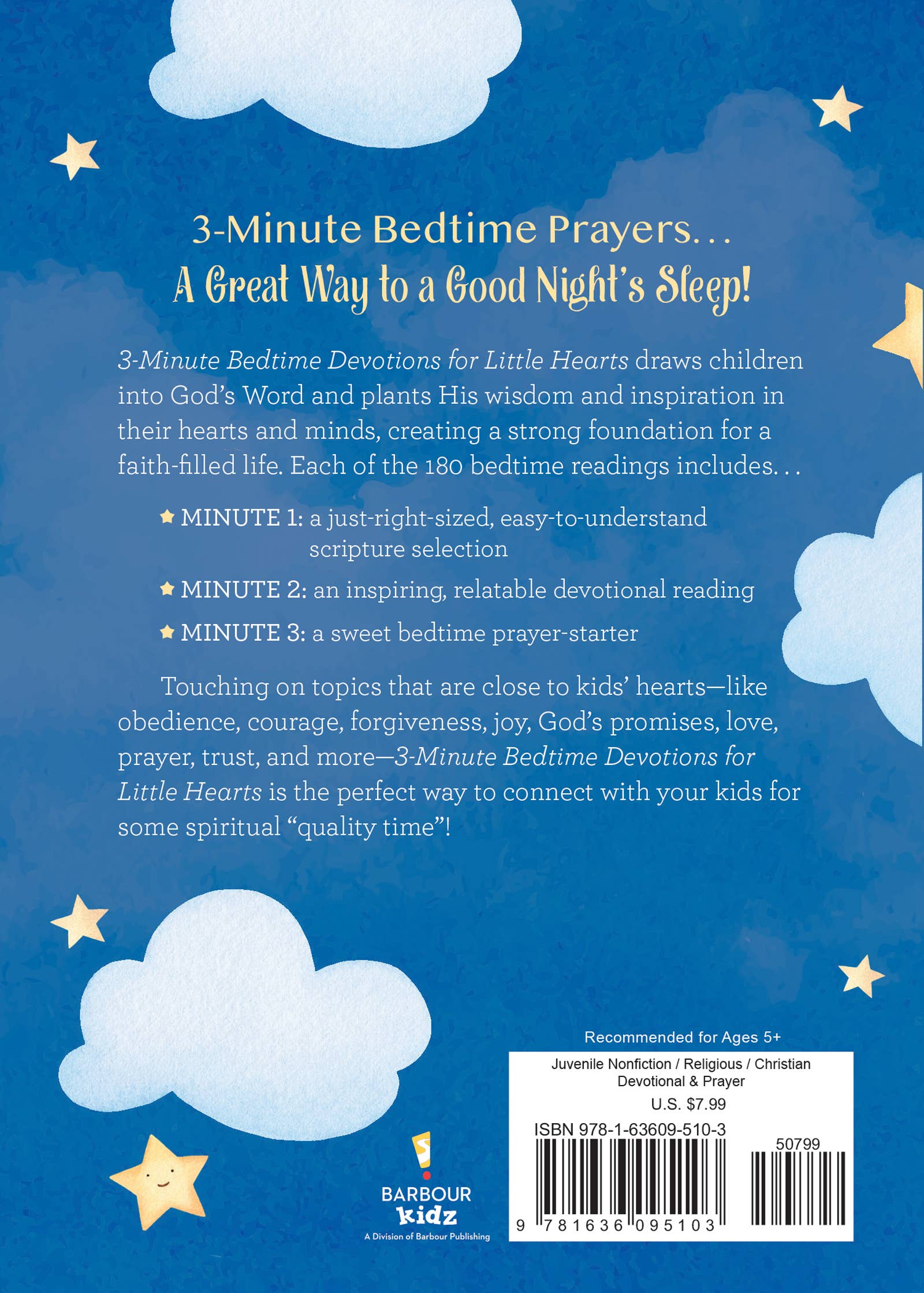 3-Minute Bedtime Devotions for Little Hearts draws children, ages 5 and up, into God's Word and plants His wisdom and inspiration in their hearts and minds, creating a strong foundation for a faith-filled life. Each of the 180 bedtime readings includes. . .