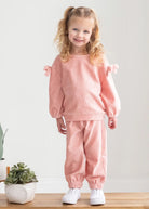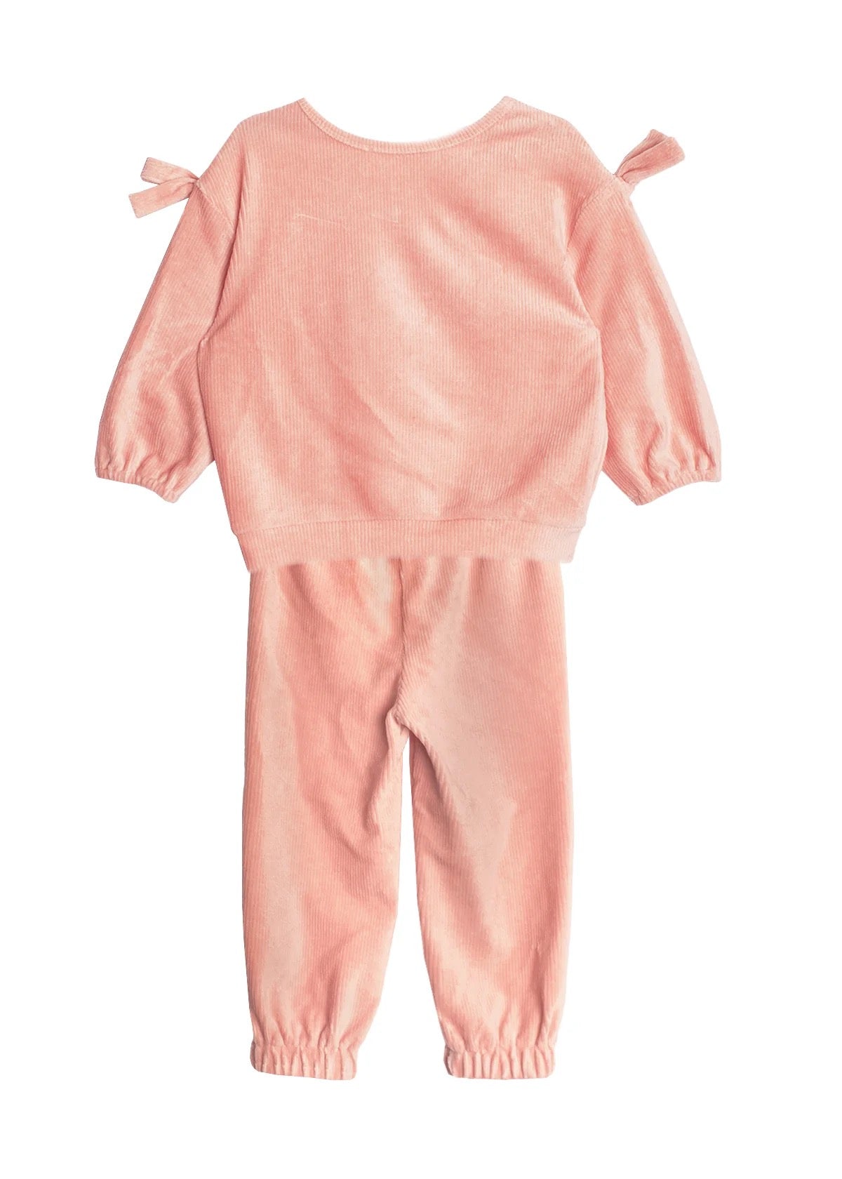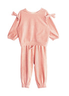 This girl's two piece set showcases a plush, velvety fabric in a soft blush pink tone. The top features charming bow-tie details on the sleeves, adding a sweet touch, while the matching pants offer an elastic waistband and cuffs for a cozy fit. Perfect for both playtime and casual outings, this set blends comfort with style.