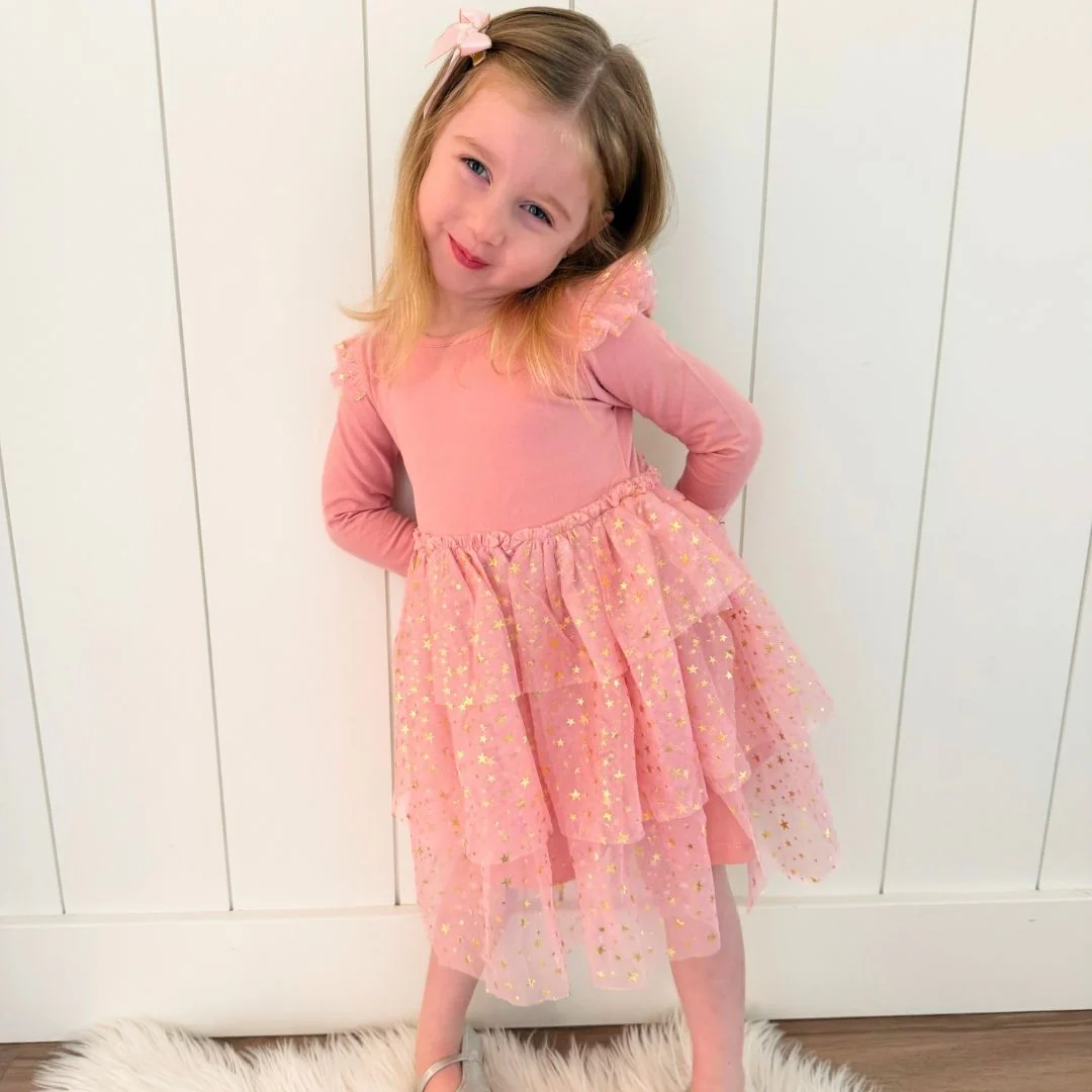 - Color: Blush pink cotton bodice with a blush pink tulle skirt overlay accented with gold star embellishments