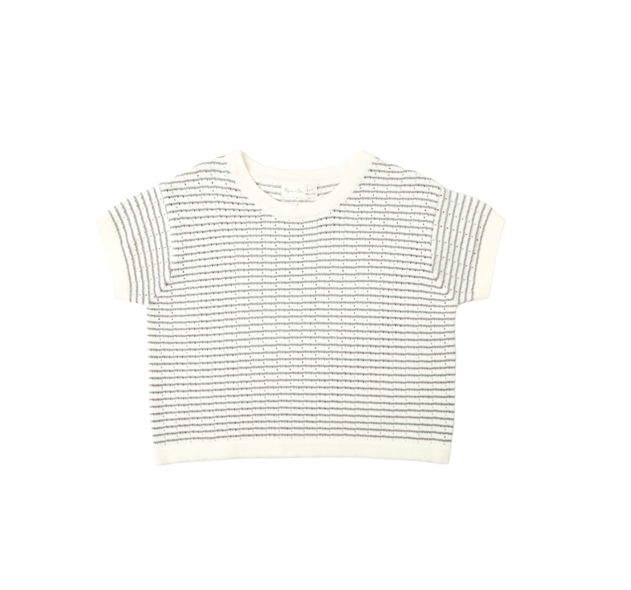Our pointelle knit boxy crop tee is comfy and playful—perfect on its own or layered. Pair it with our Knit Wide Leg Pant to complete the look!