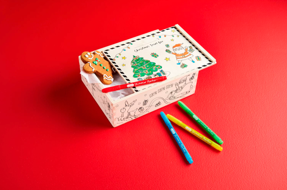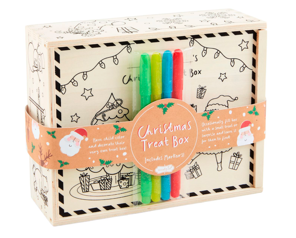 Wood box comes with markers for child to decorate their very own holiday treat box. Fill the box with small surprises throughout the season and leave it for them to find.