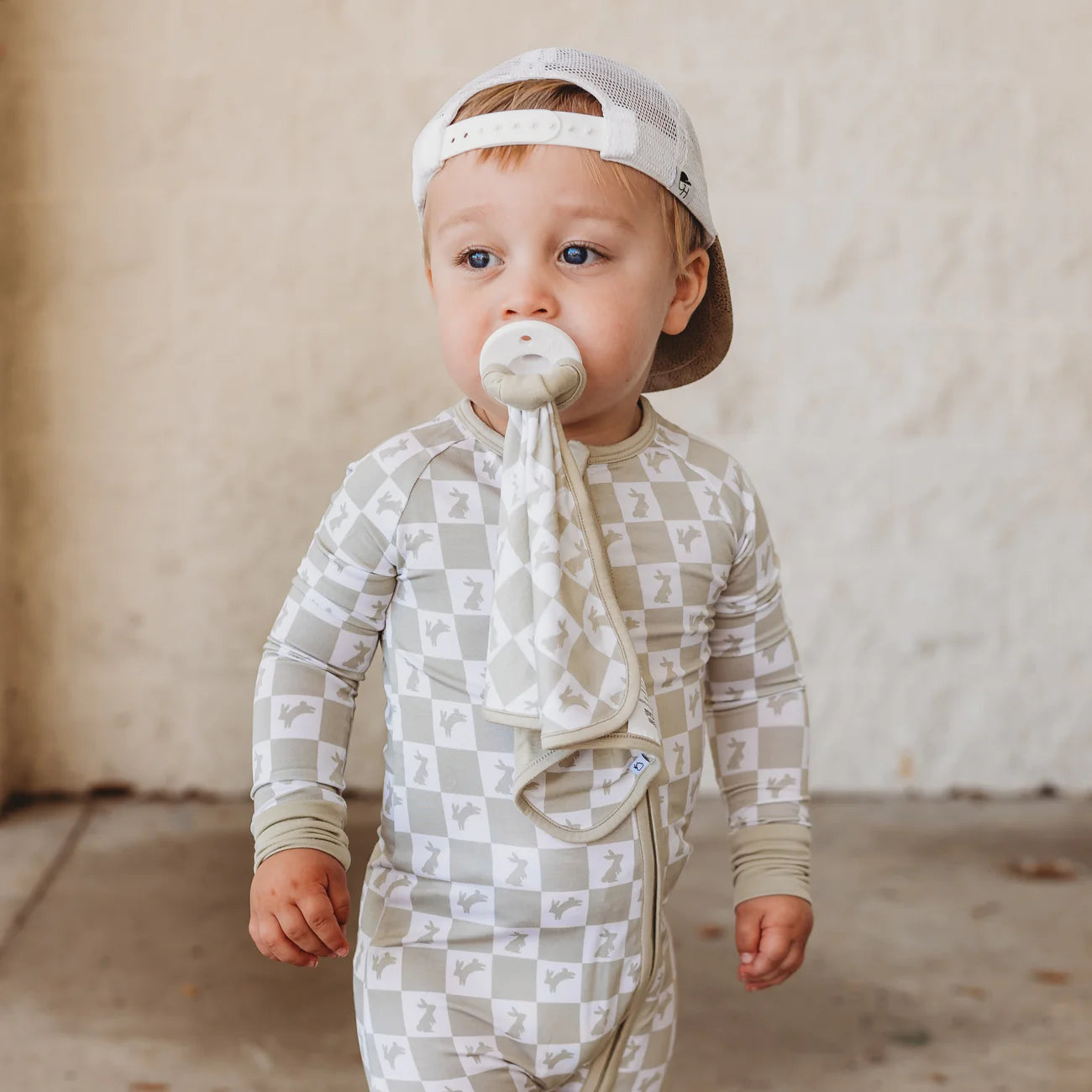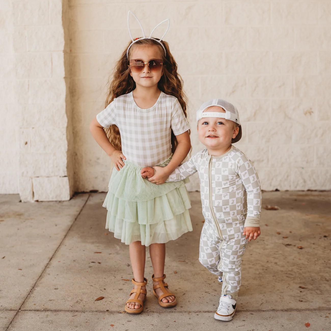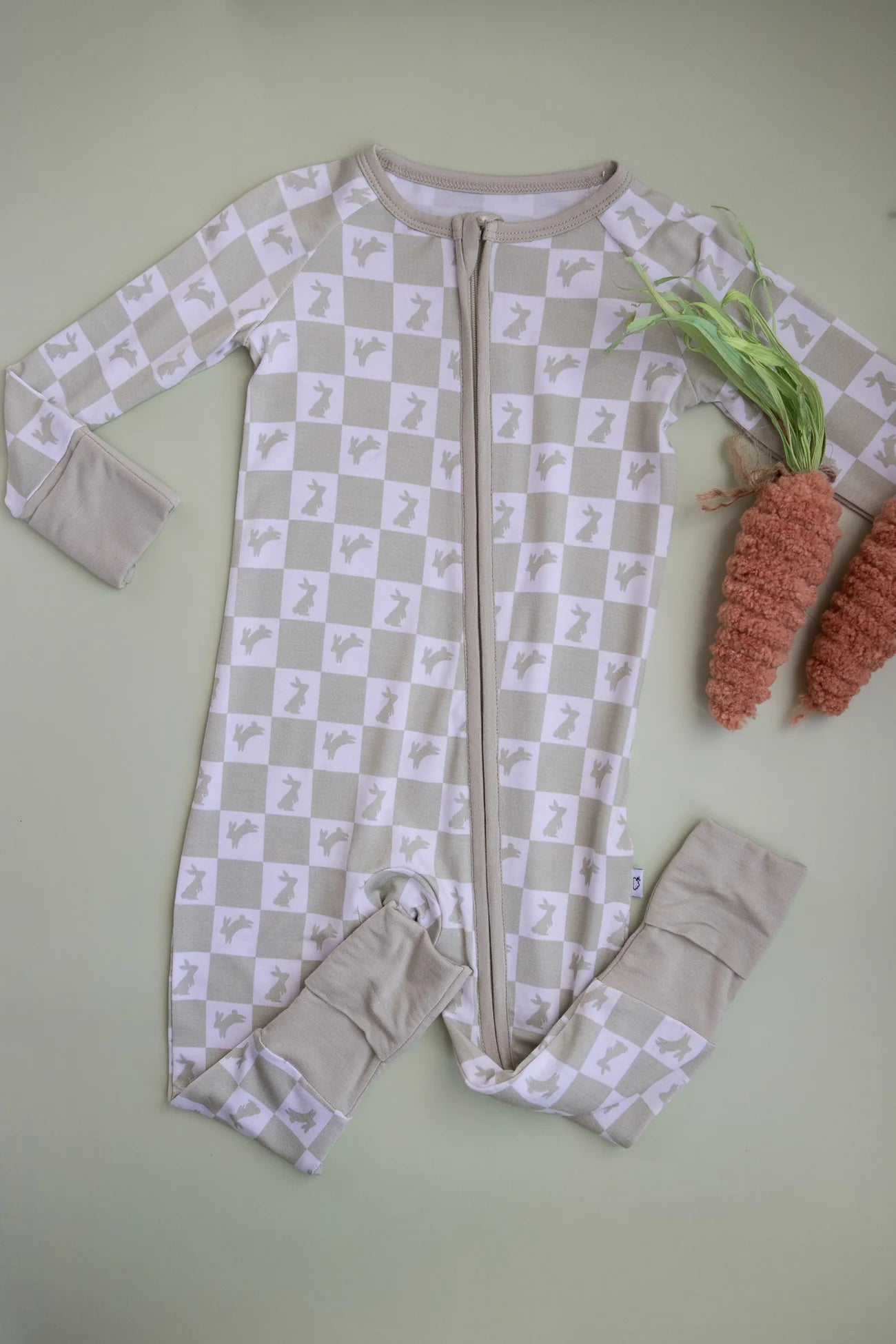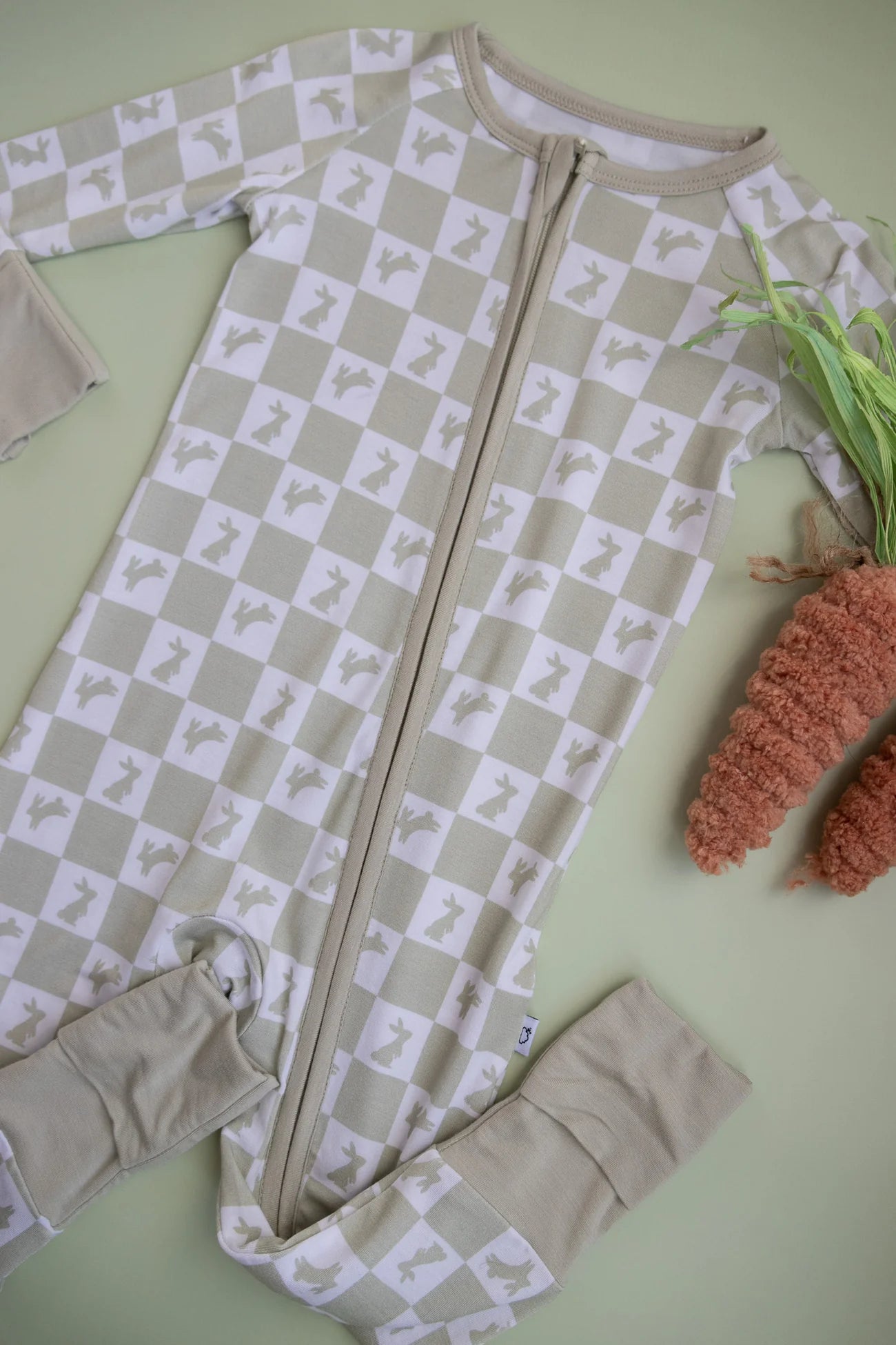 Hop into the coziest dreams with our Hippity Sage Checkers Dream Romper! This long sleeve bodysuit features a playful sage checkered bunny print for a fun and comfortable nighttime look. Sleep tight and wake up feeling refreshed and stylish.