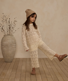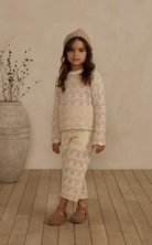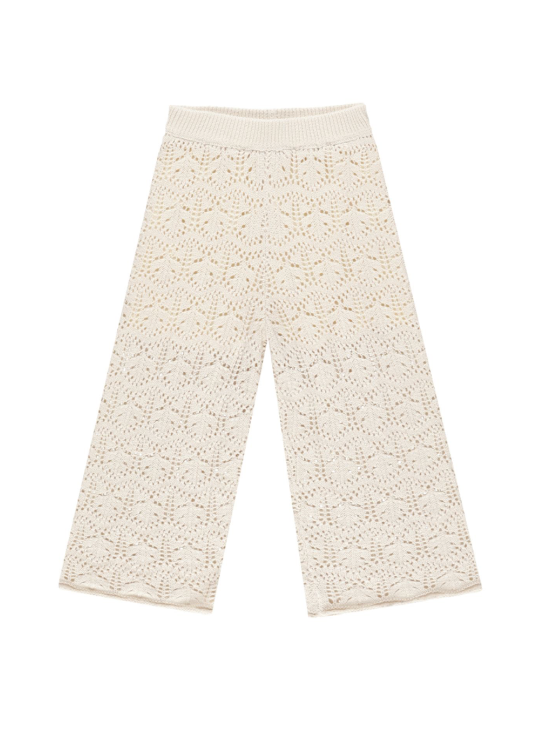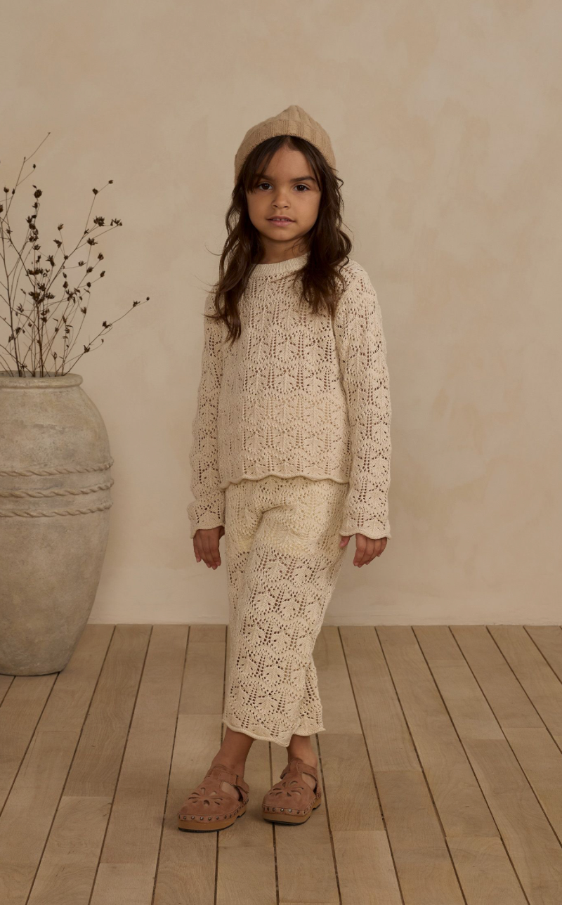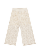Crochet knit pants featuing a ribbed waistline, scallop hem, and a short liner. Paired perfectly with our Crochet Knit Pullover!