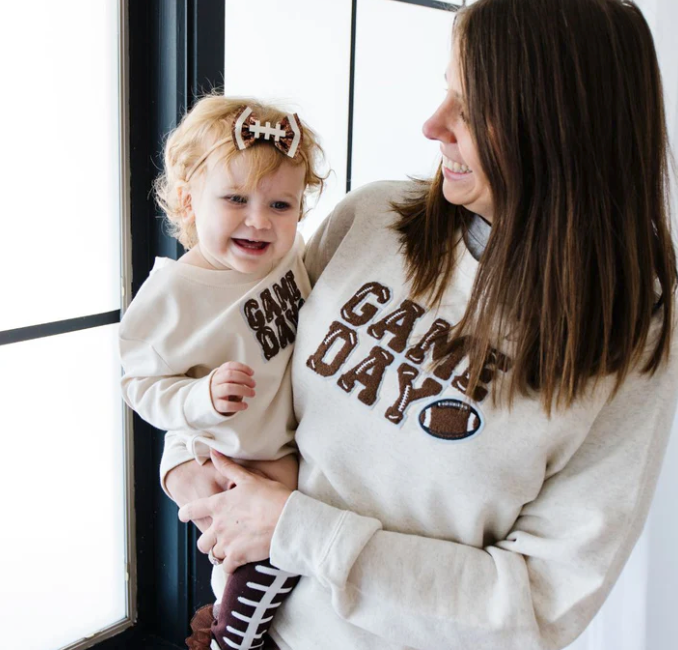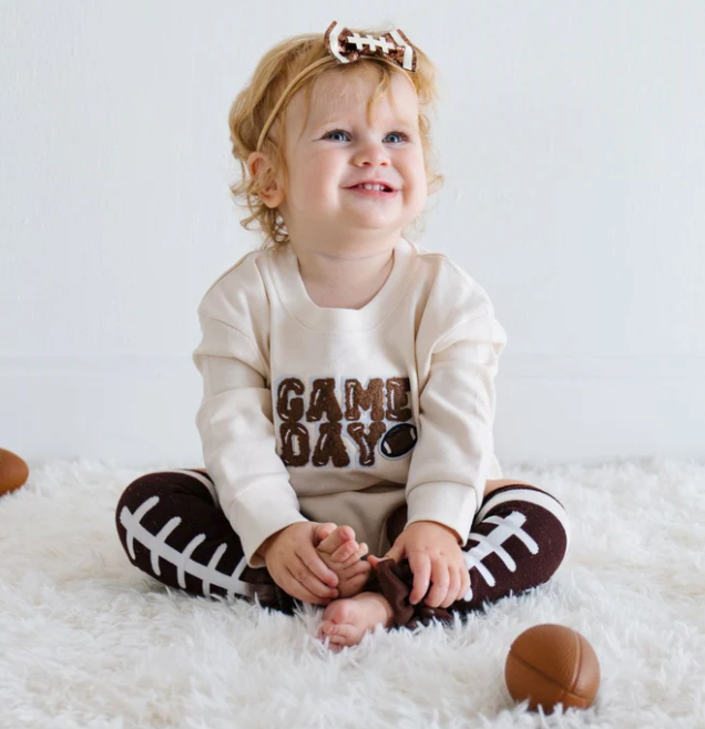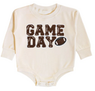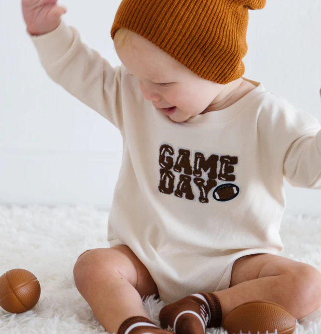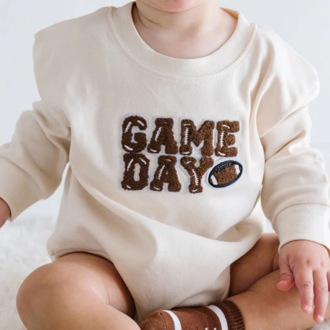 The Game Day Patch Long Sleeve Romper is a fun and cute romper for babies celebrating Game Day!