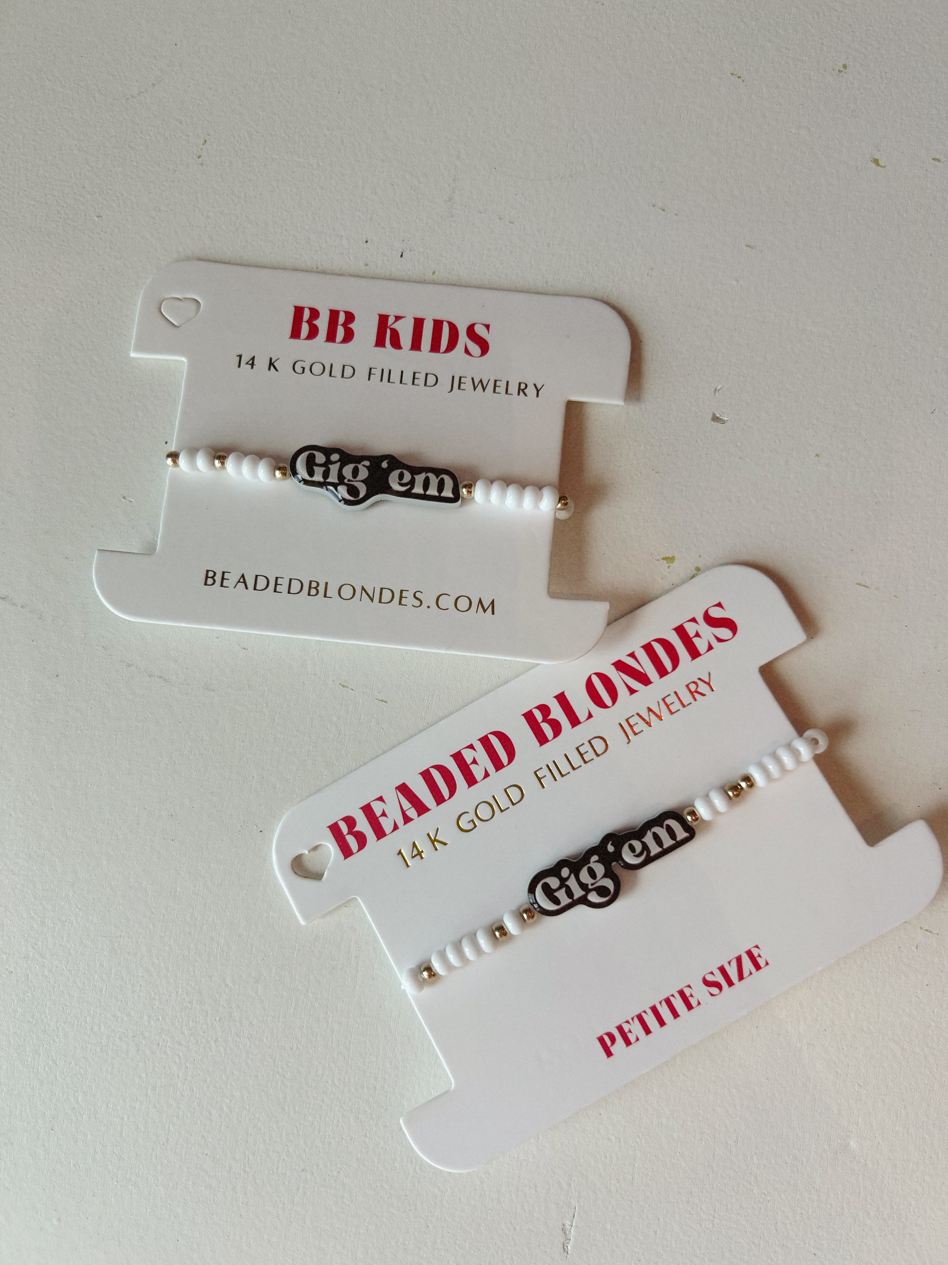 Gig Em Bb Bead On White Sprinkle comes in 5.5 inch and 6.25 inch.