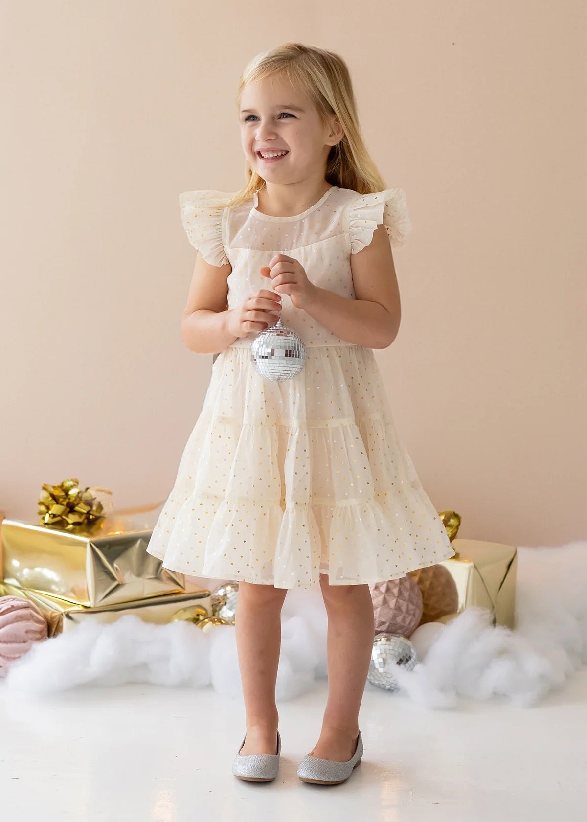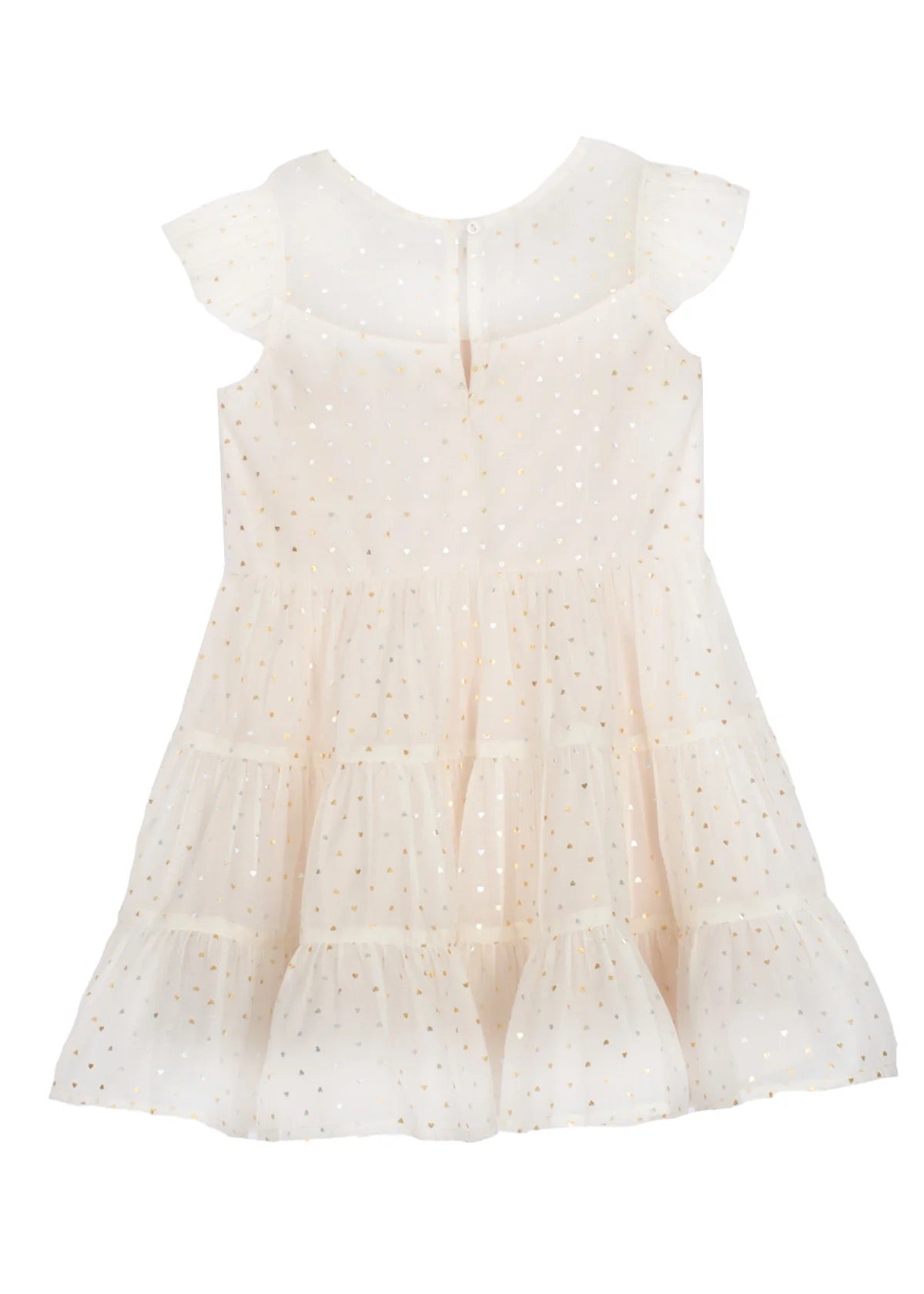 This girl's dress features a soft, cream-colored fabric embellished with delicate gold hearts, adding a touch of sparkle. The sleeveless design is accented with ruffled shoulders, while the skirt flows with tiered layers for added volume and movement. Perfect for special occasions, this dress combines elegance with playful charm.