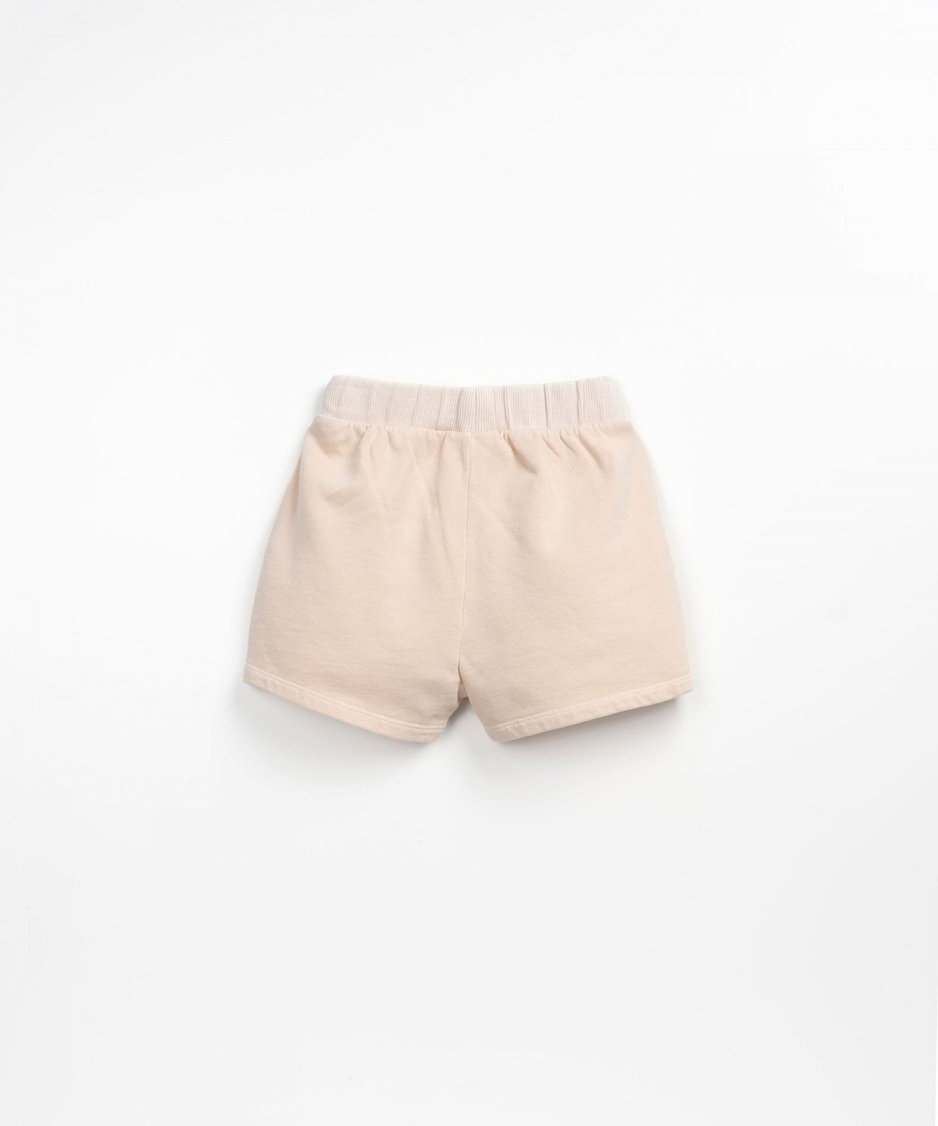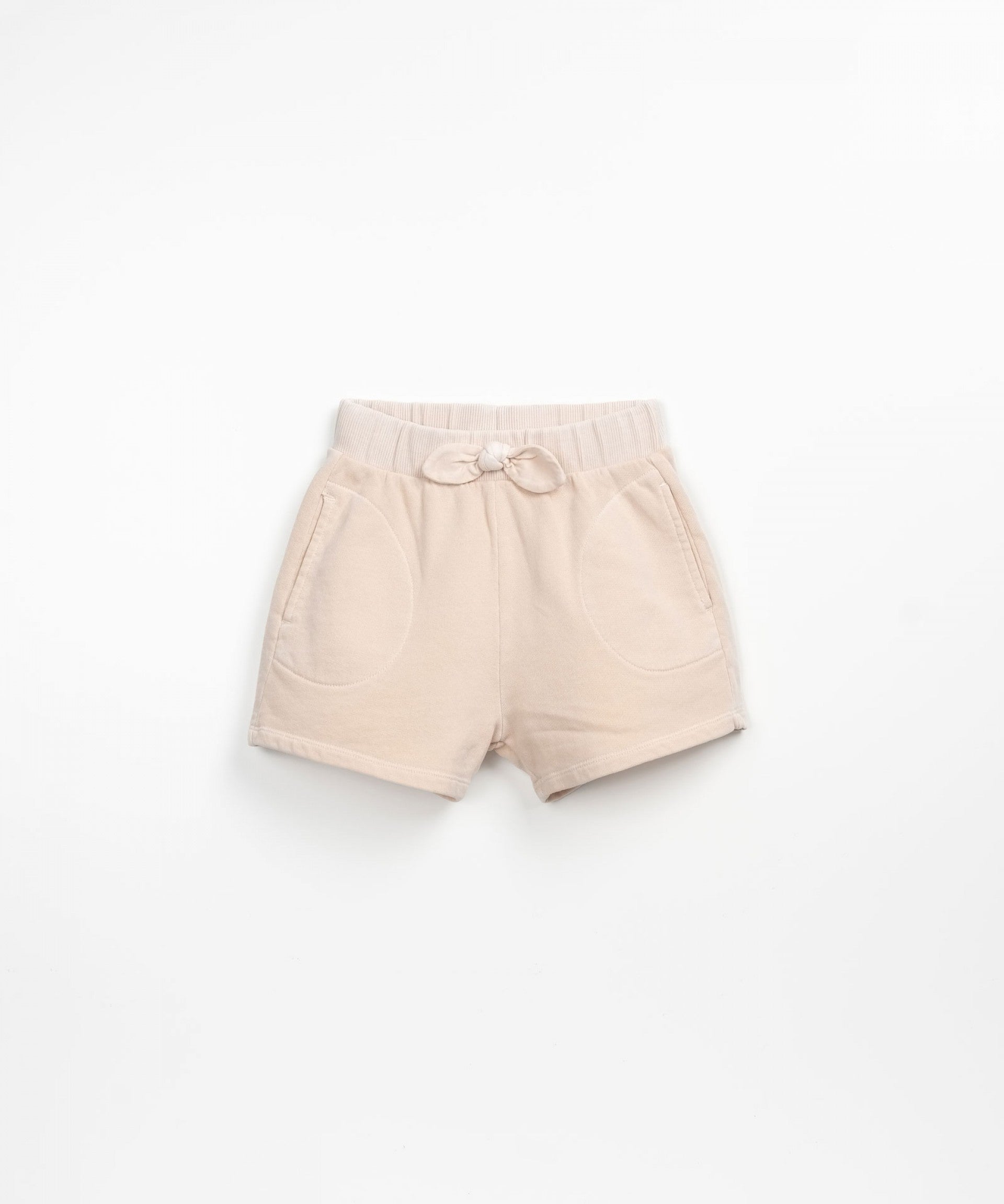 These jersey-stitch shorts are made of a mixture of organic cotton and cotton, Slow colour. The model has an elastic waist, a decorative bow and front pockets.