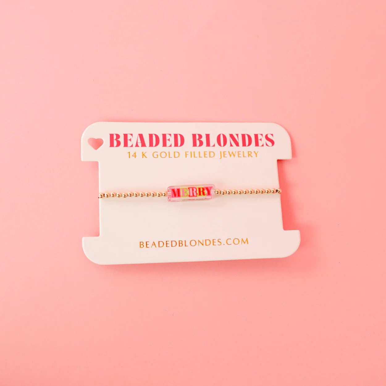 • 3MM gold beaded stretch bracelet with an acrylic Merry bead that will not fade.