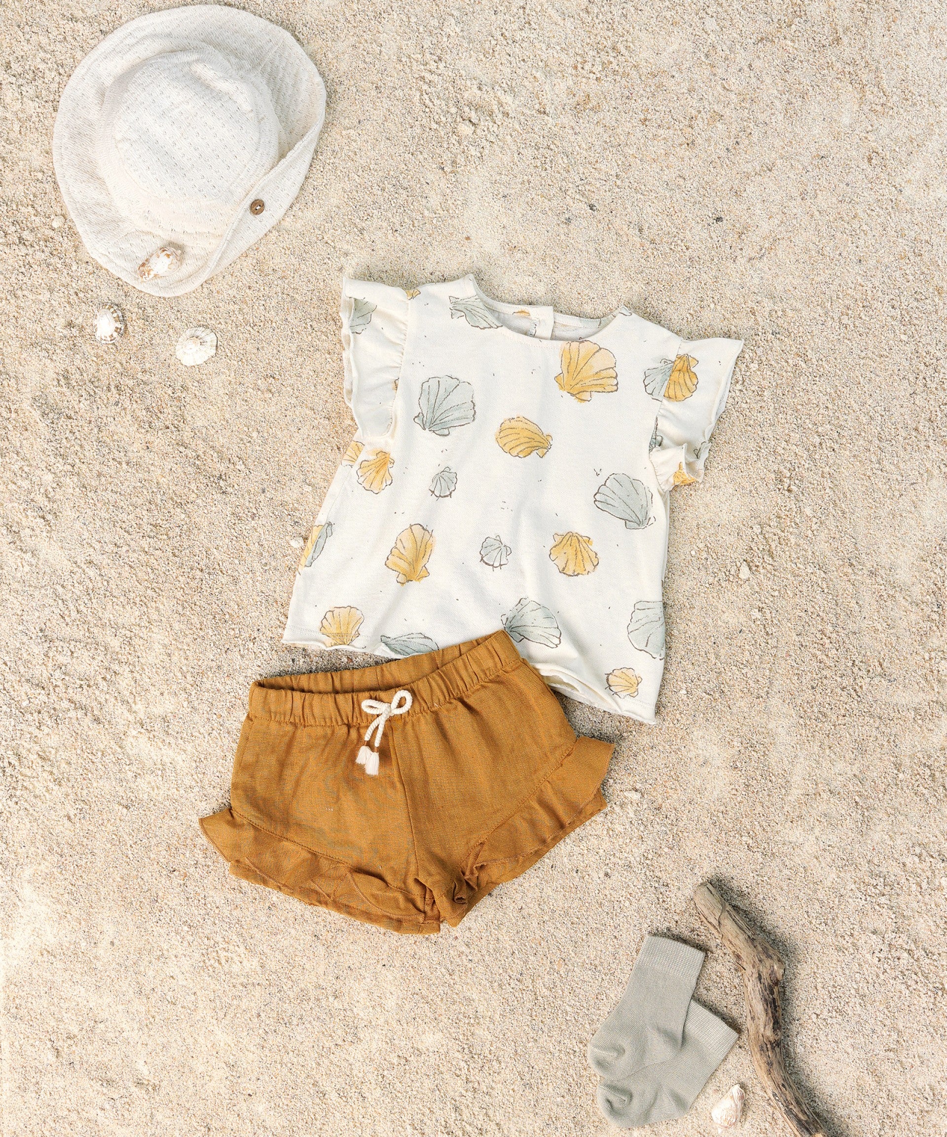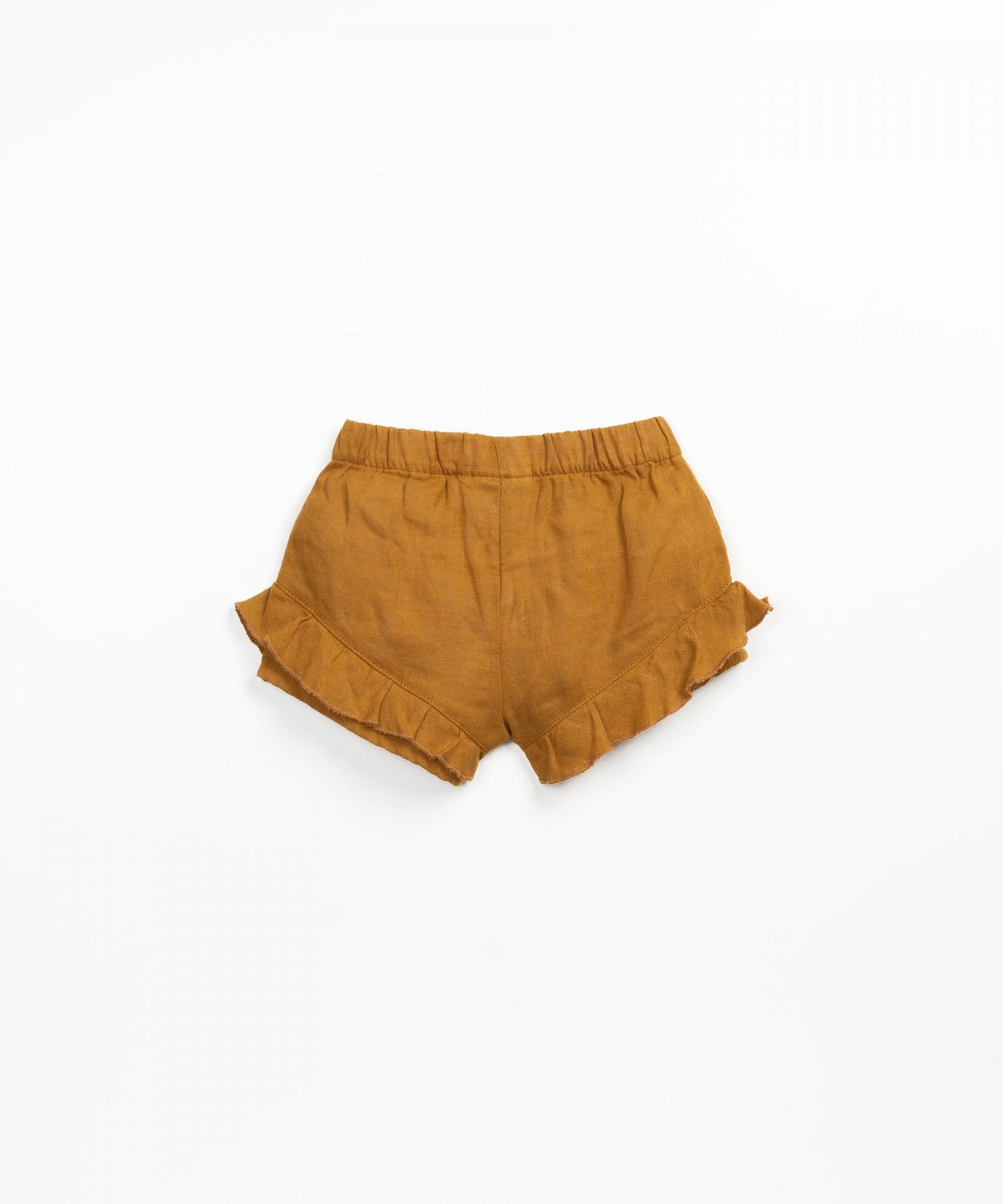 These shorts are made of linen, Vanessa colour. The model has an elastic waist,a decorative bow and a frill detail at the hem.