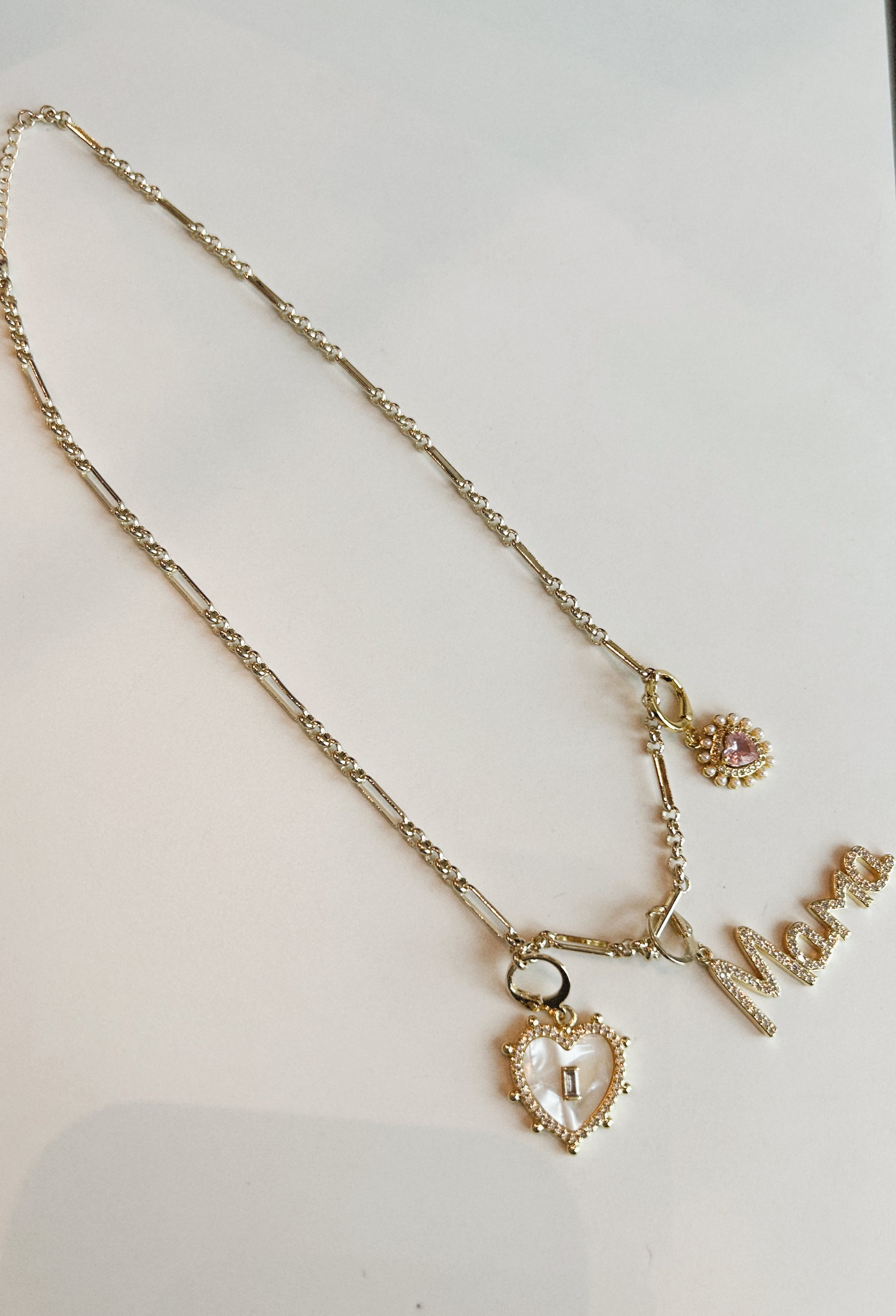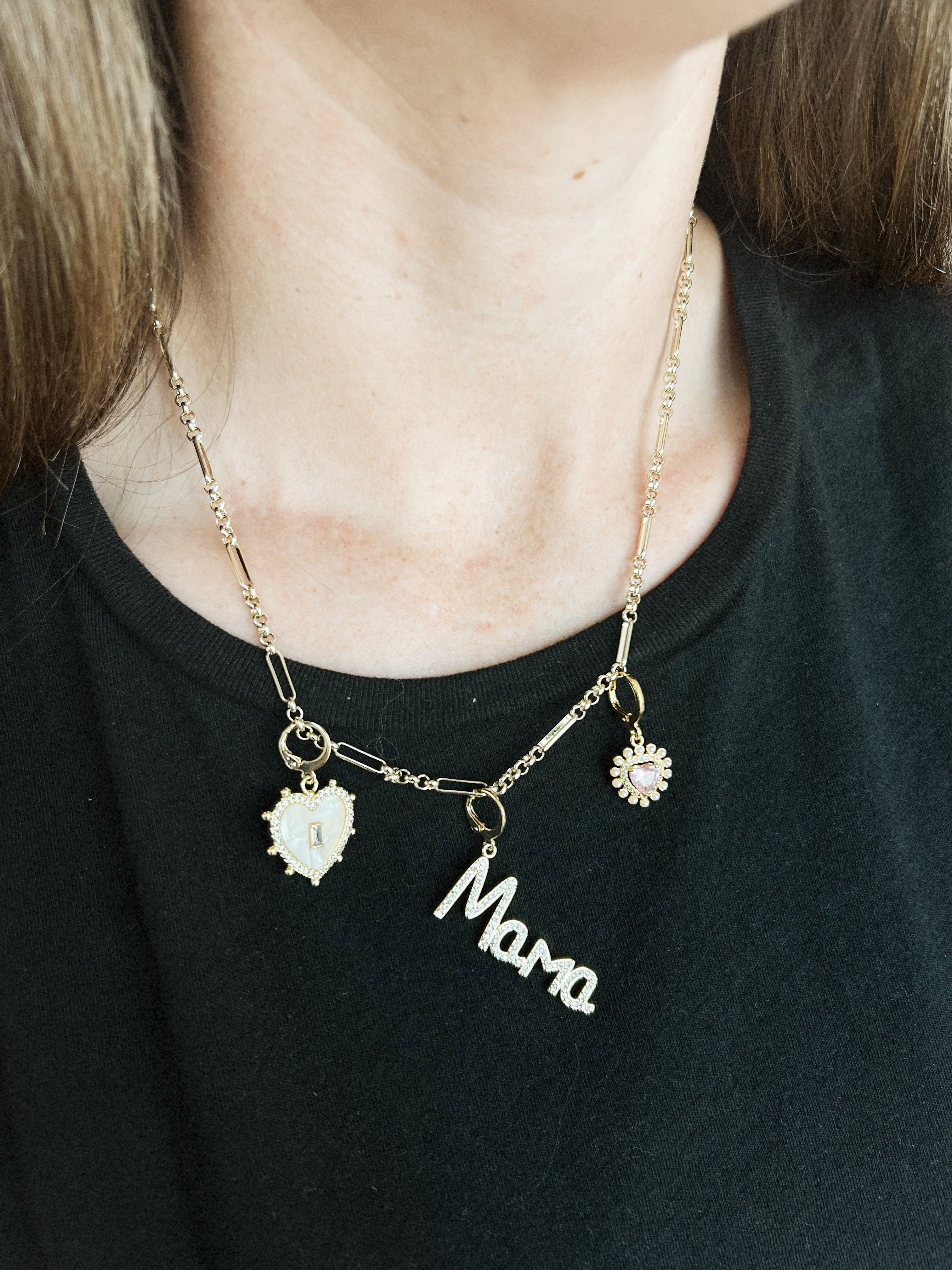 Celebrate the special bond with this playful Mama Charm Necklace, featuring delicate gold hearts that add a touch of warmth and love to any outfit. Perfect for moms who cherish their little ones close to their heart every day.