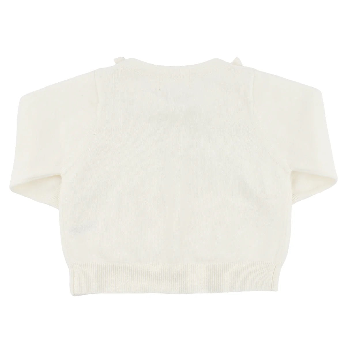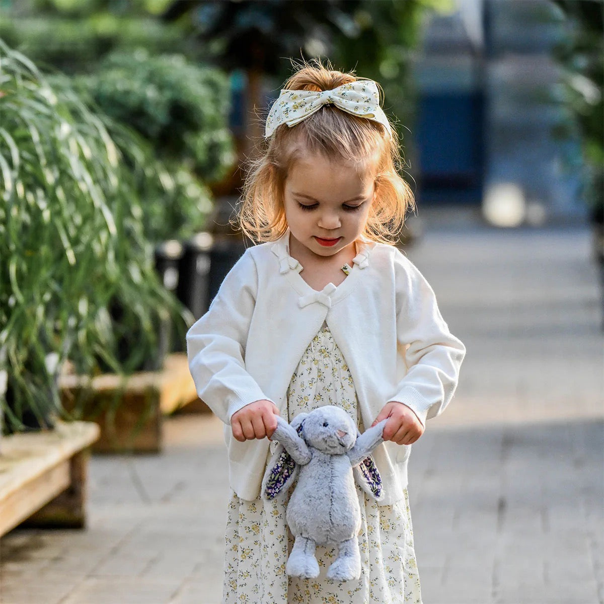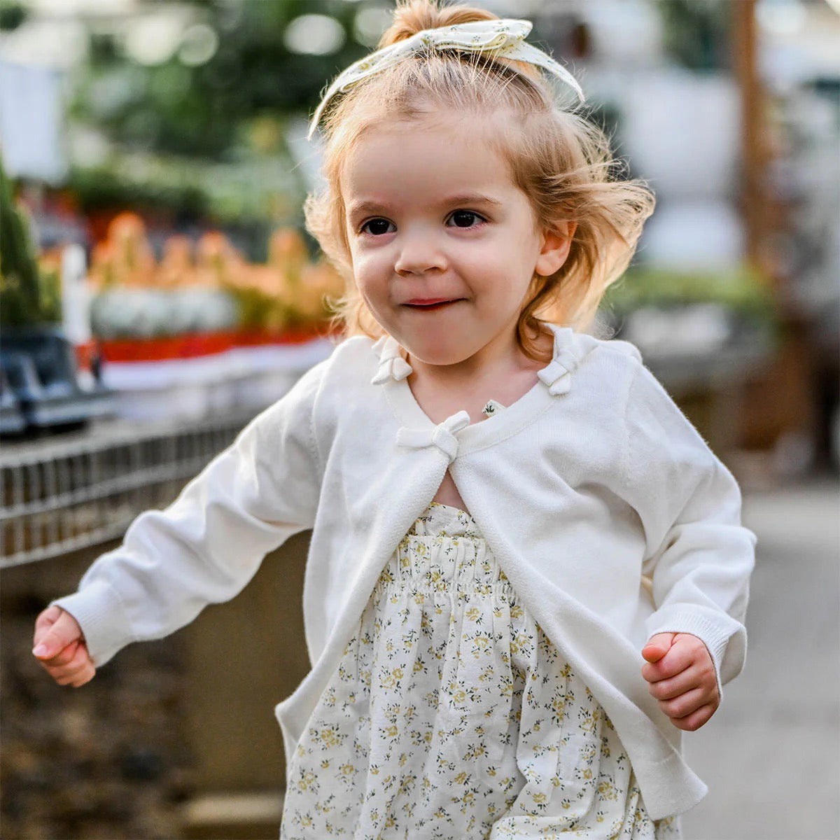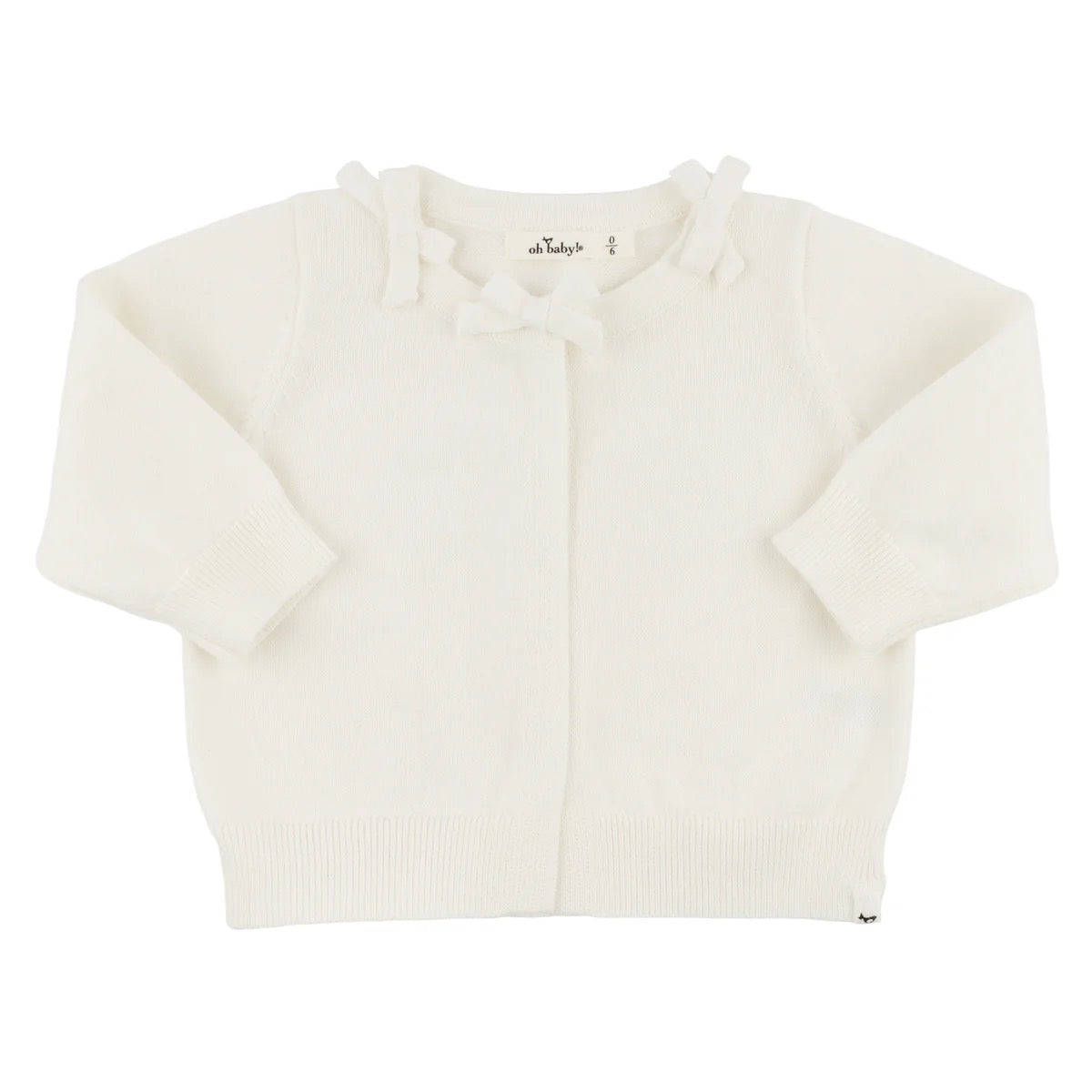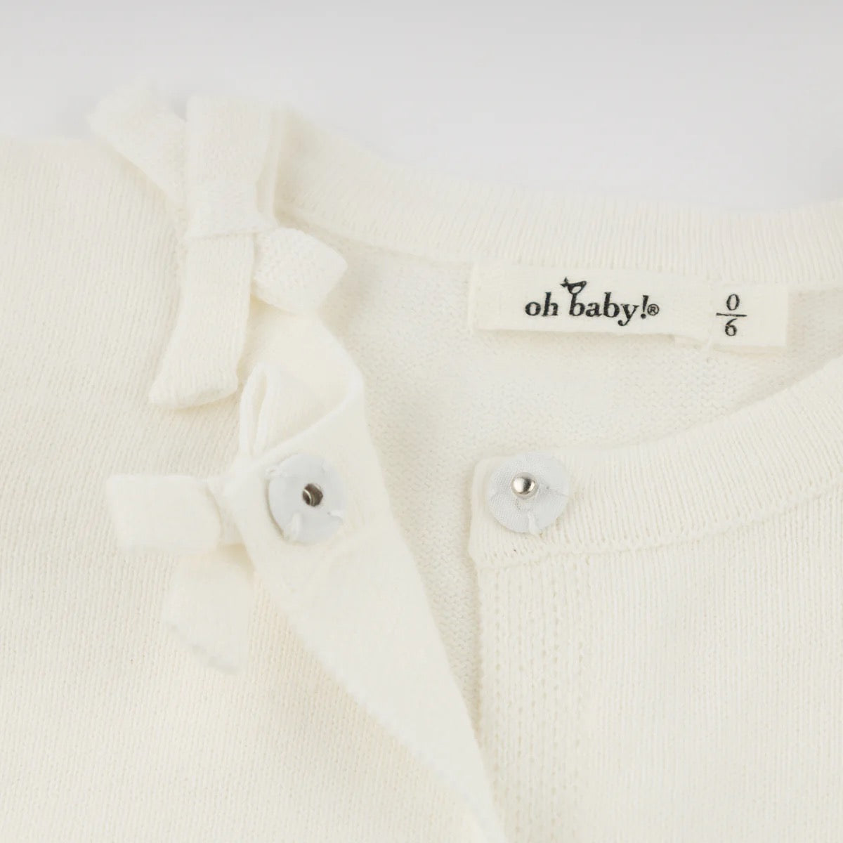 Introducing our oh baby! Mini Bow-Neck Knitted Long Sleeve Cardigan, perfect for any girl's summer wardrobe. The neutral cream color makes it easy to coordinate with any outfit, making it a versatile and stylish choice. Light enough for summer, but warm enough for those cooler evenings