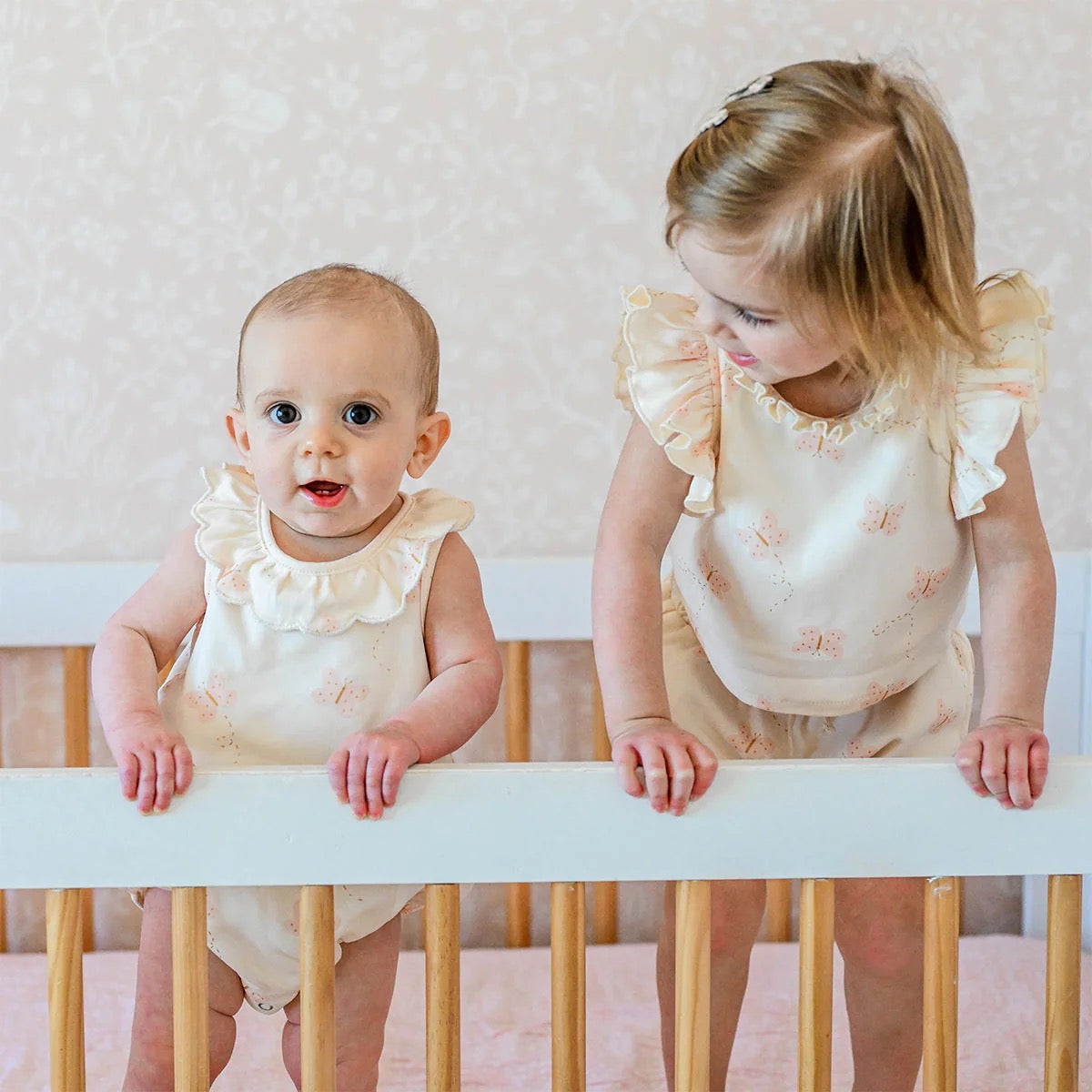 Made from soft cotton, our oh baby! Jamie Shorts Set features mini pink butterflies, ruffled neck and sleeves with elastic waist pocket shorts. Designed in Minnesota. Available in infant and toddler sizes.