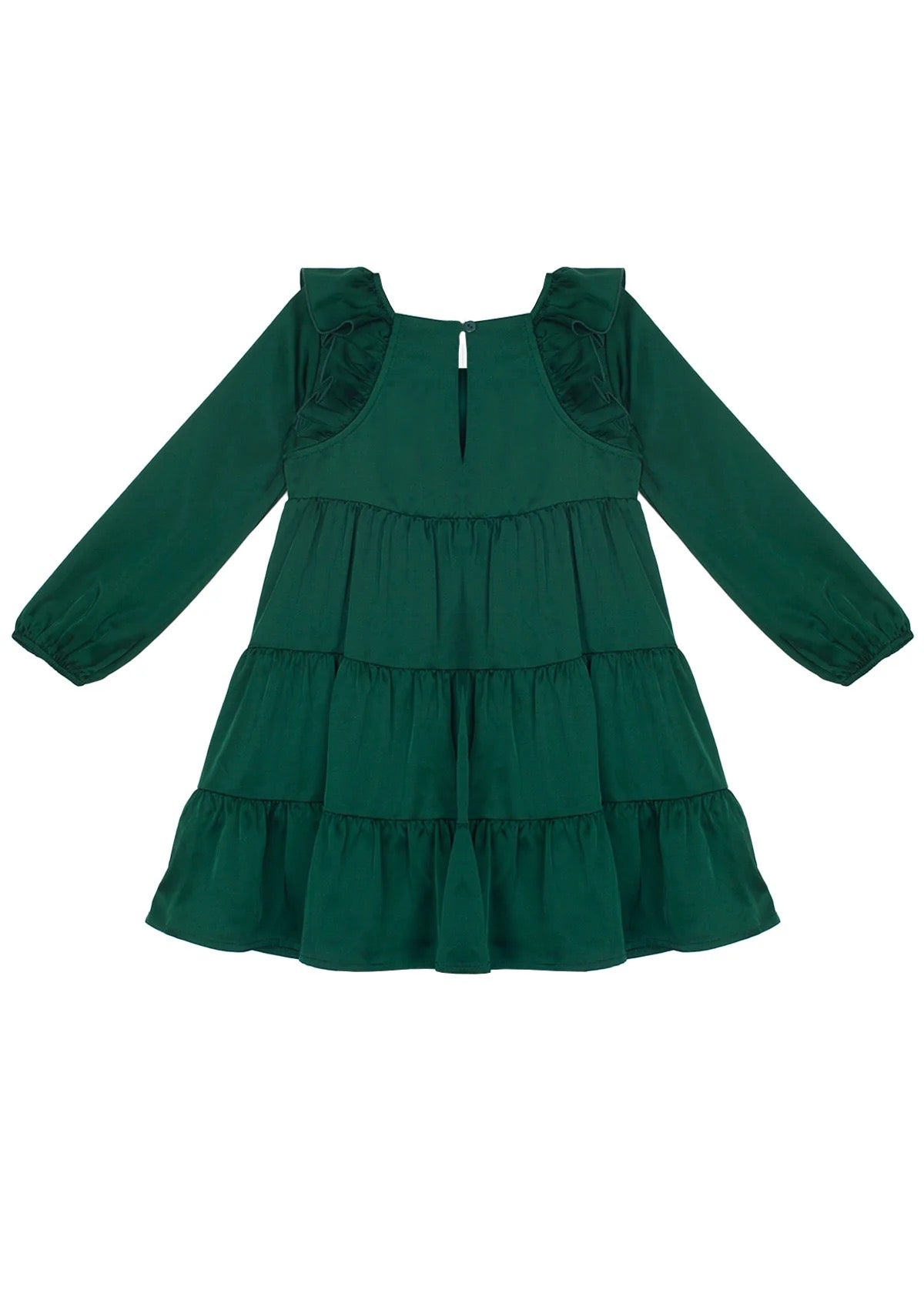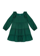 Celebrate in style with the Mistletoe Dress, crafted in a vibrant emerald green cotton. This dress features playful ruffle details on the shoulders and a tiered skirt that adds a festive flair. The long sleeves and comfortable fit make it perfect for holiday parties and family photos.