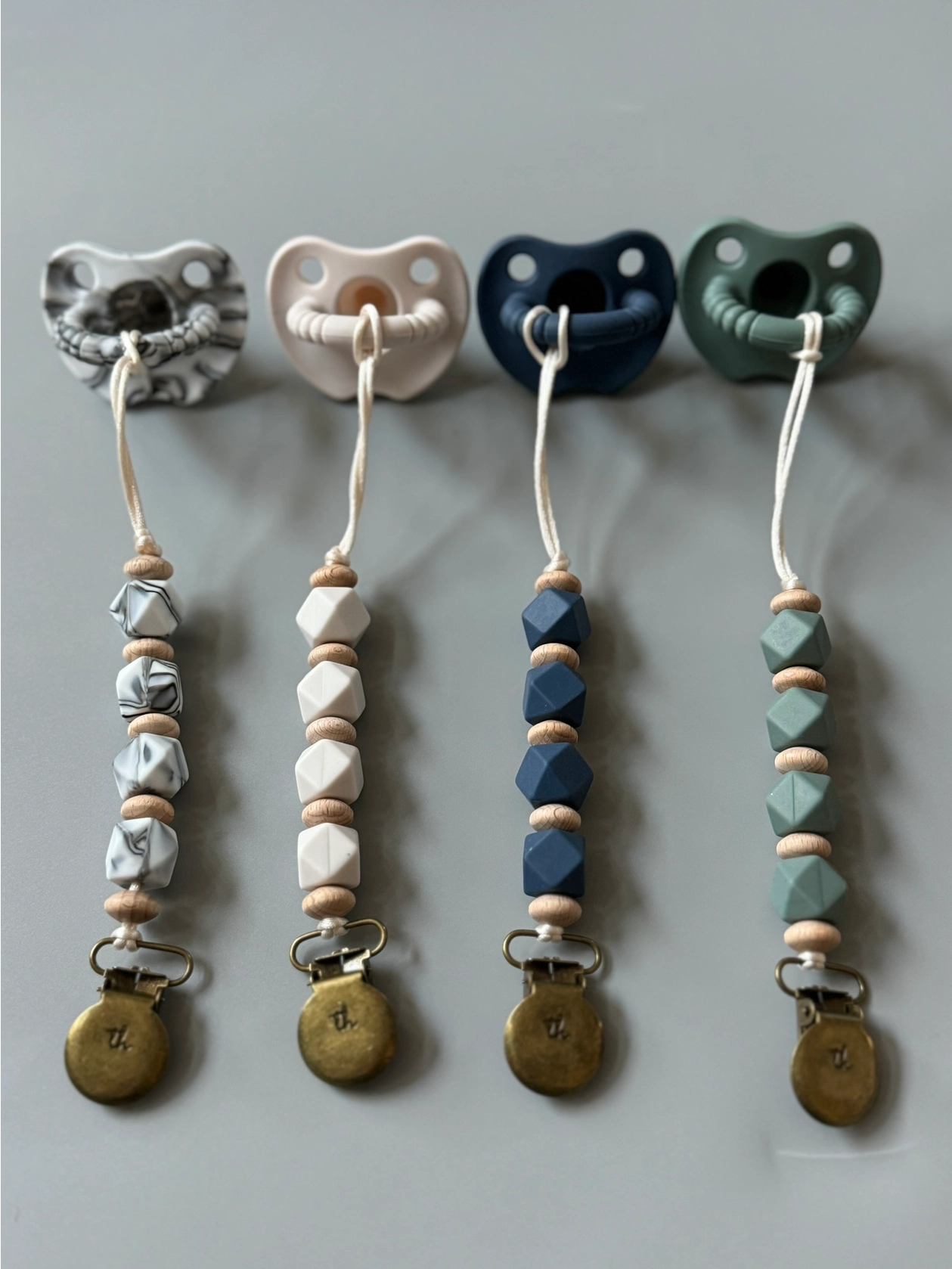 The pacifiers are our best selling colors paired with a matching pacifier clip that also holds toys.