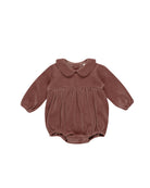 Peter Pan baby romper has longsleeves and cute peter pan collar along the neck. Also has snap buttons along the bottom for easy changing.