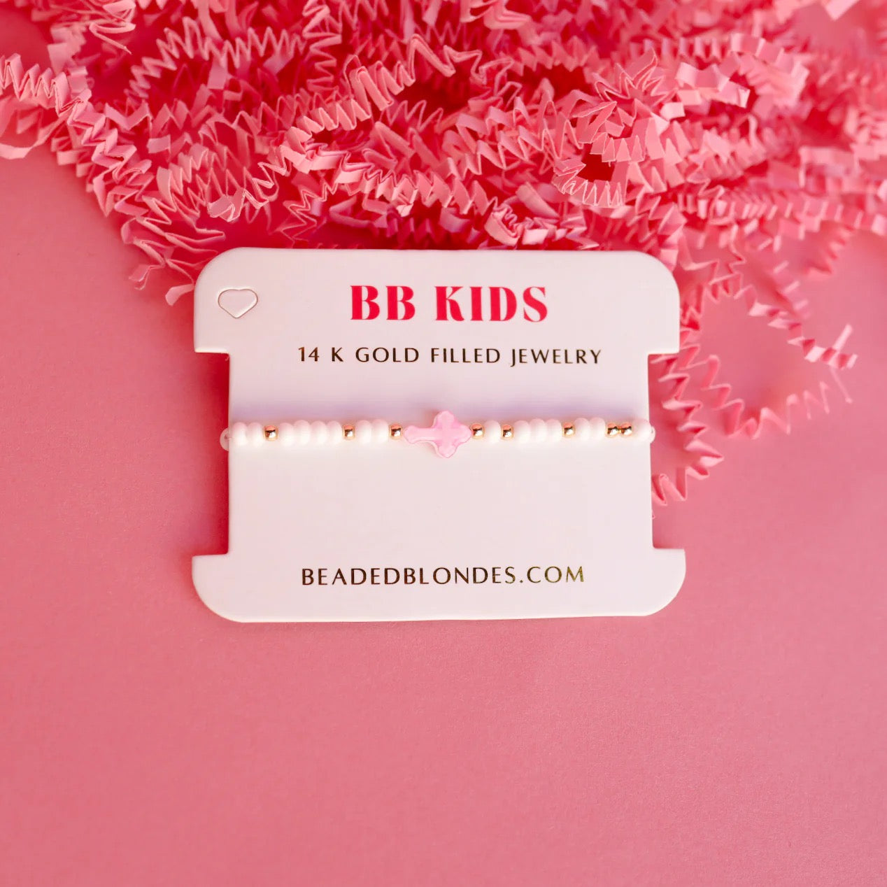 Pink Cross beaded bracelet. Our signature 14 K gold filled beaded bracelets with custom made beads. Kids size 5.5 inch.