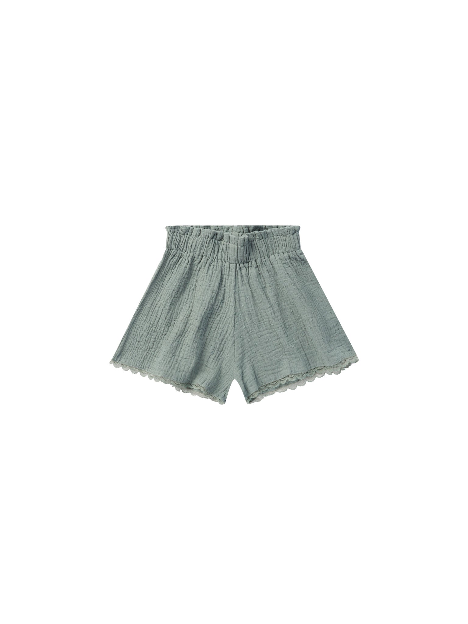 Swiss dot details, gathered and elastic waistline, and lace trim details on these super airy shorts. Pair with Remi Top for complete look.