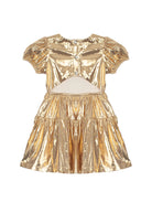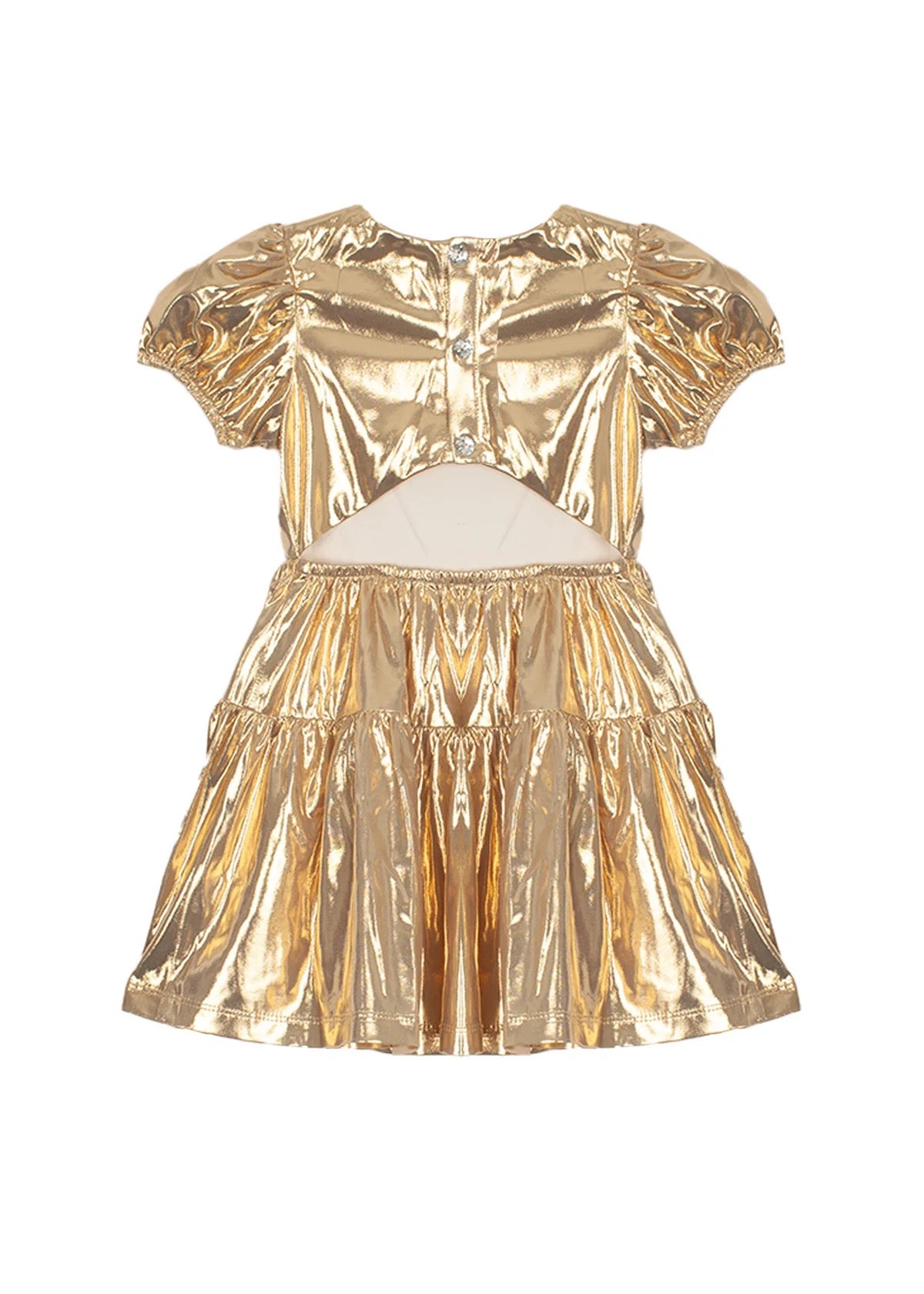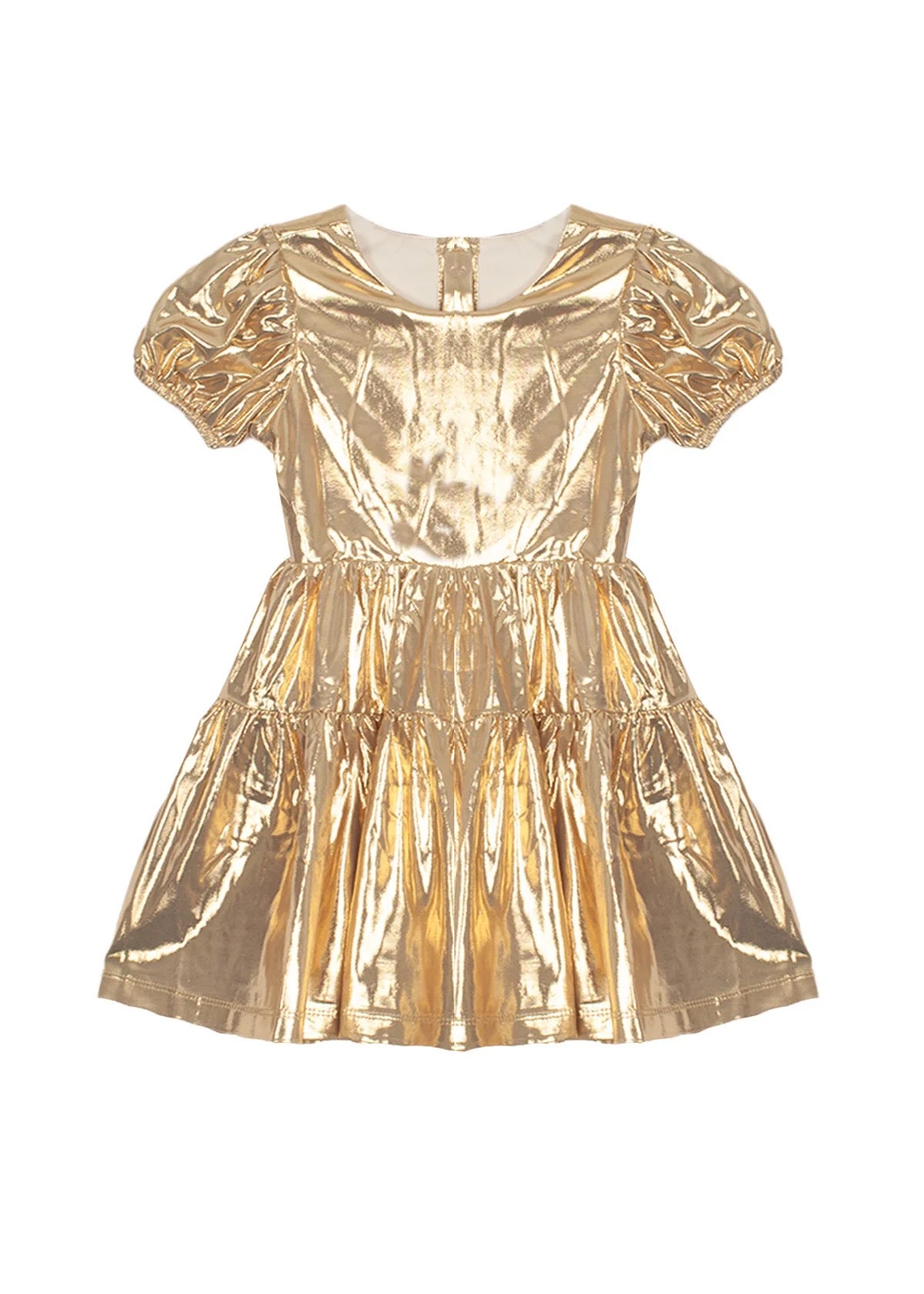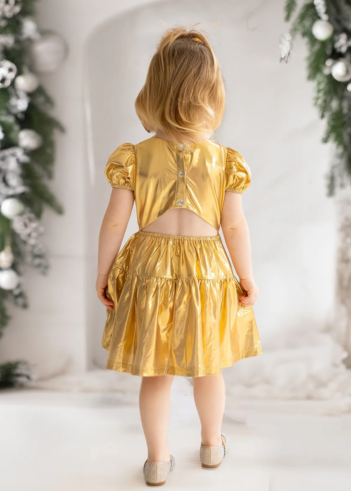 This girl's dress dazzles in a metallic gold hue, offering a striking, glamorous look for special occasions. Crafted from a lightweight, shiny fabric, the dress features puffed short sleeves, a gathered skirt for added volume, and a back zipper closure for easy wear. Perfect for making a bold statement.