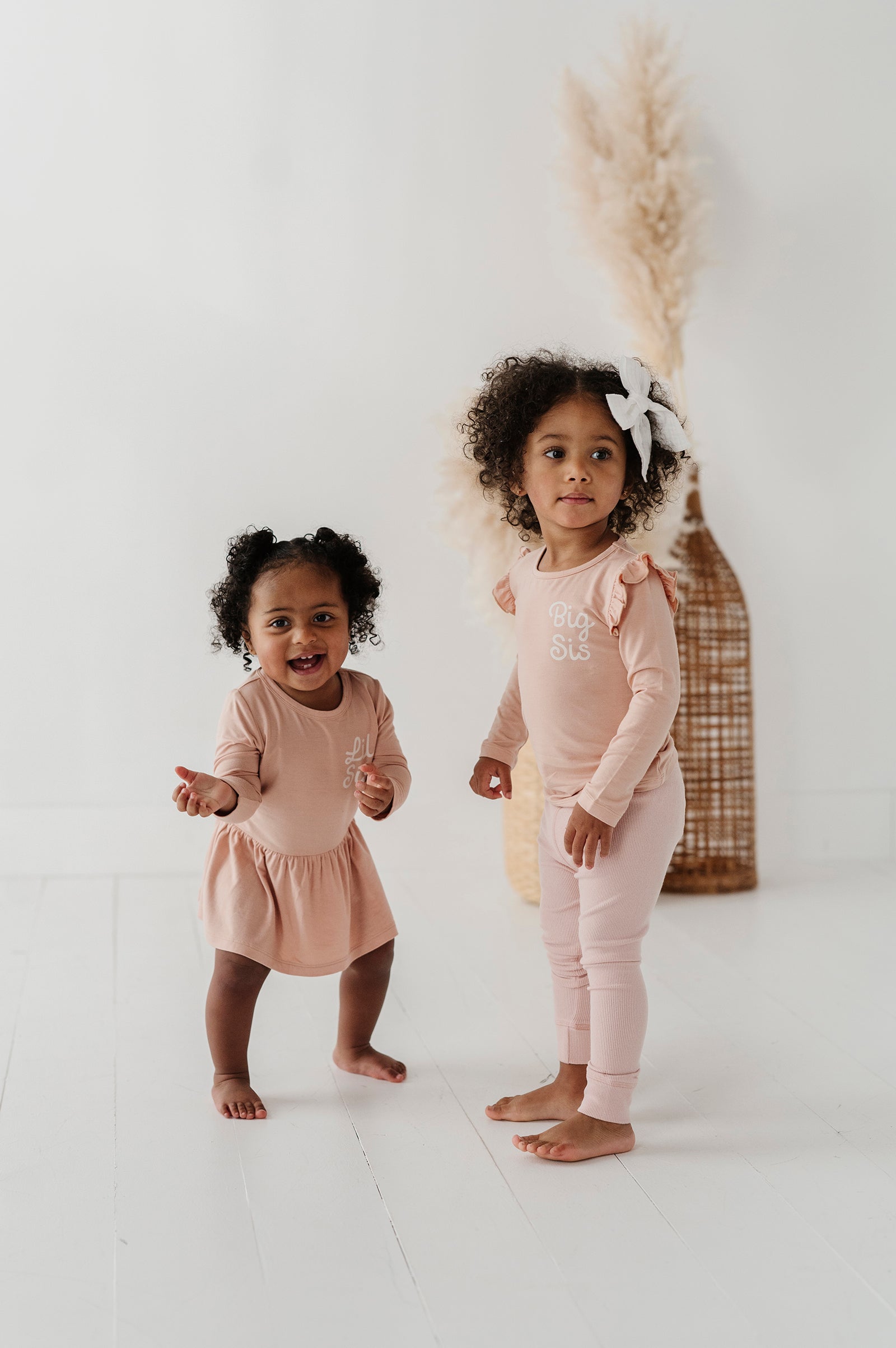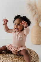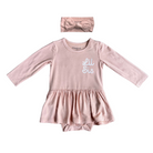 Our sweet new Ruffle Bodysuit Dress Set is a cute set that features a bodysuit dress and matching headband for baby girls up to 18/24 M. Made with our premium bamboo jersey fabric. Designed in the US | All colors and designs are exclusive to Babysprouts Clothing Co