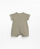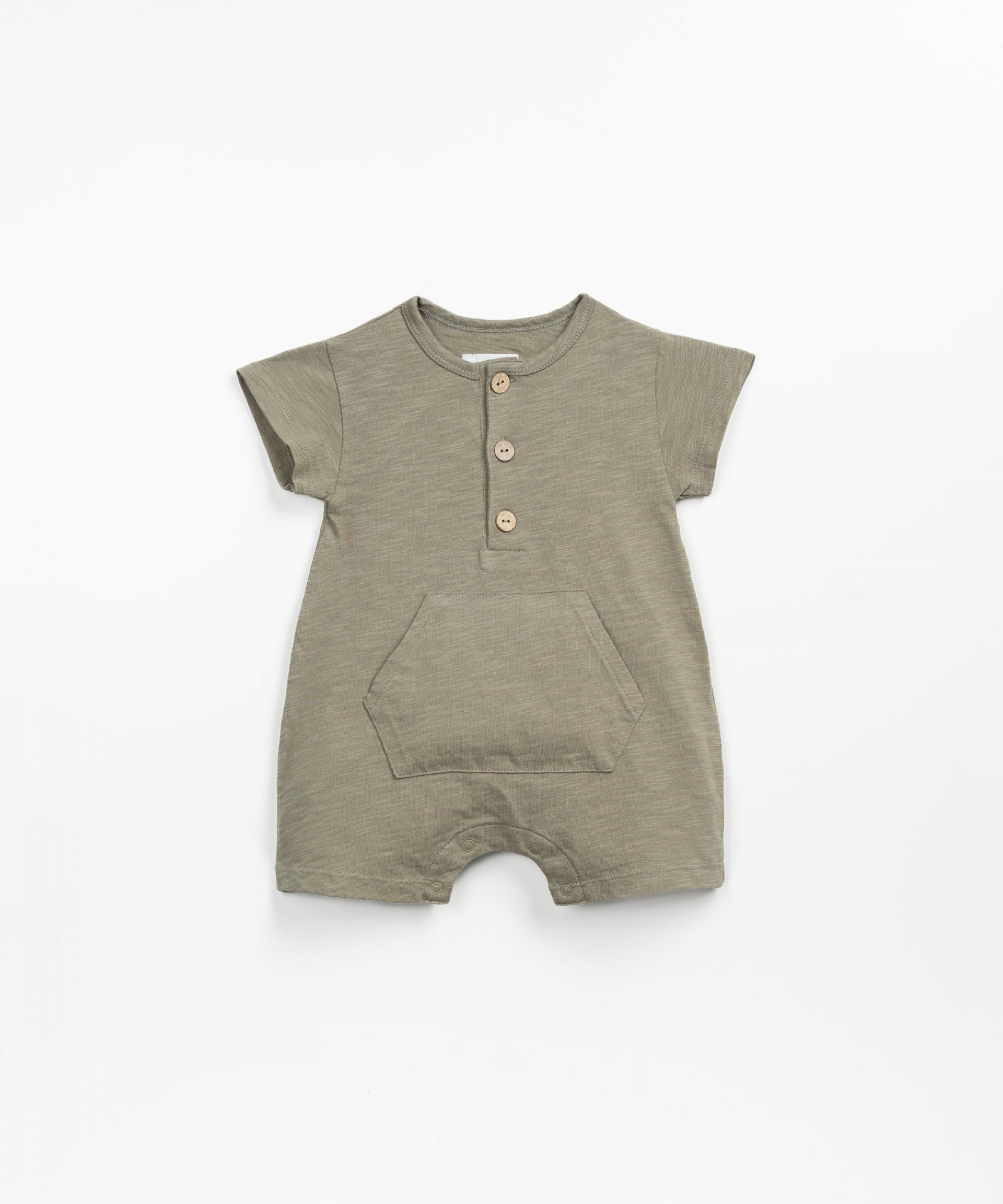 This jumpsuit is made of jersey stitch organic cotton, Recycled colour. This short-sleeved model has a round neck, an opening on the front with coconut buttons and a crotch opening with nickel-free metal clips (crotch opening up to size 18M)