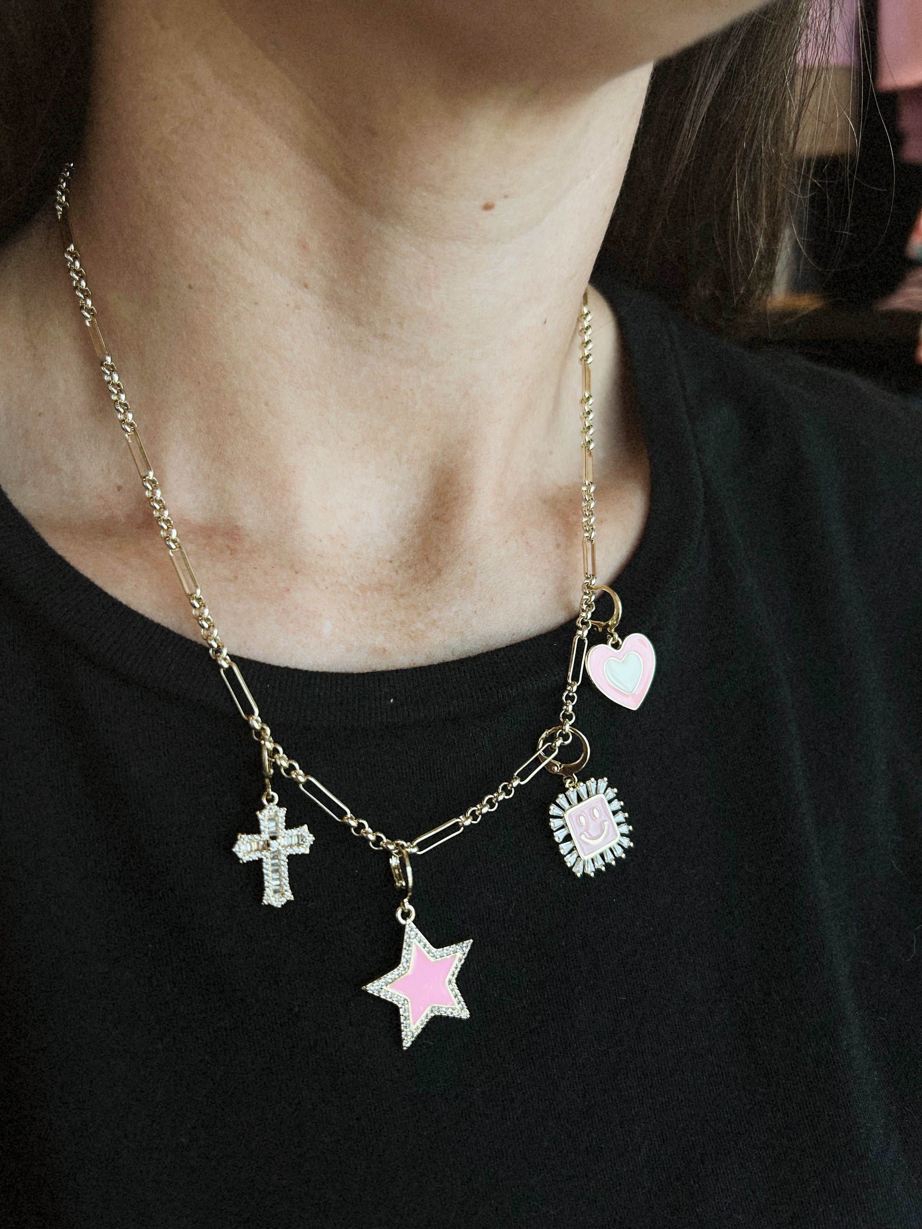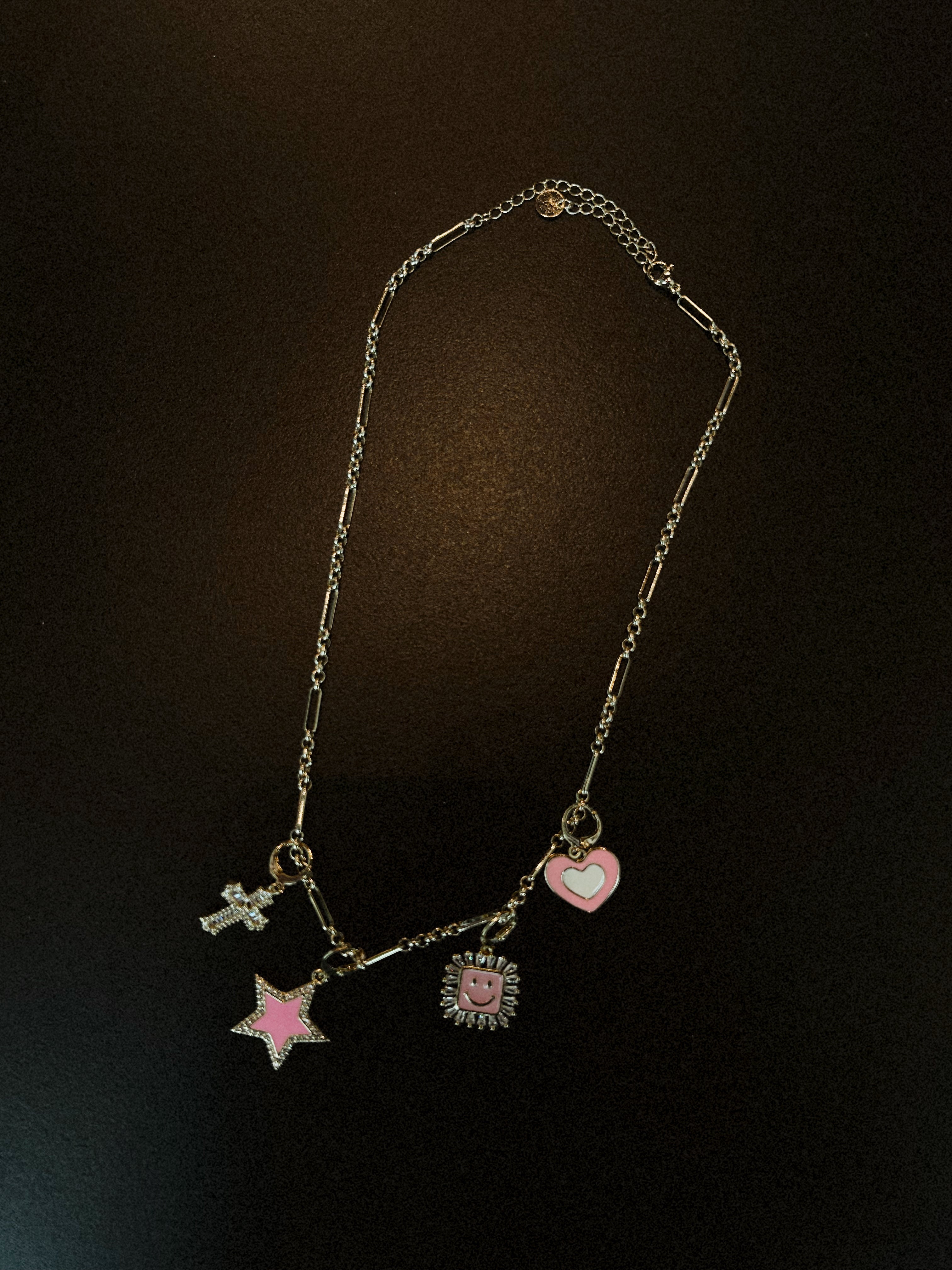 Brighten your day with the Smiley Charm Necklace, featuring a cheerful smiley face paired with a cross, star, and heart charm. This playful combination adds a fun and meaningful touch to any outfit, perfect for spreading positive vibes wherever you go.