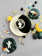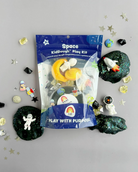 Includes: 8 oz Black (Black Cherry) KidDough with Space Glitter and Space Charms (Earth, Moon, Satellite, Astronaut, UFO), Astronaut Figurine, Planet Figurine, Crescent Moon Figurine, Rocket Figurine, Yellow, Silver and Black Acrylic Space Rocks.