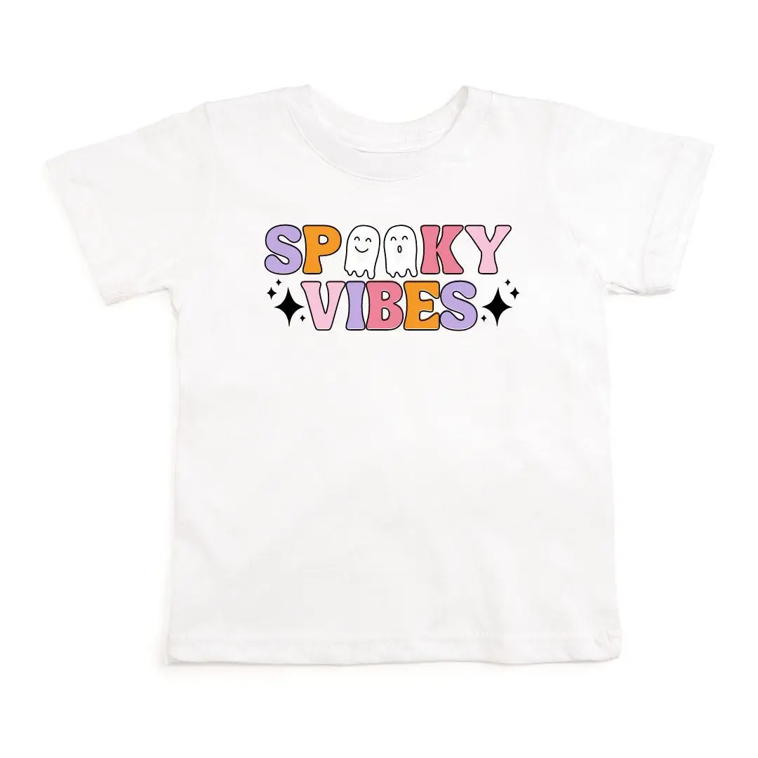 The Spooky Vibes Halloween Short Sleeve T-Shirt is a fun and festive t-shirt for kids celebrating Halloween!