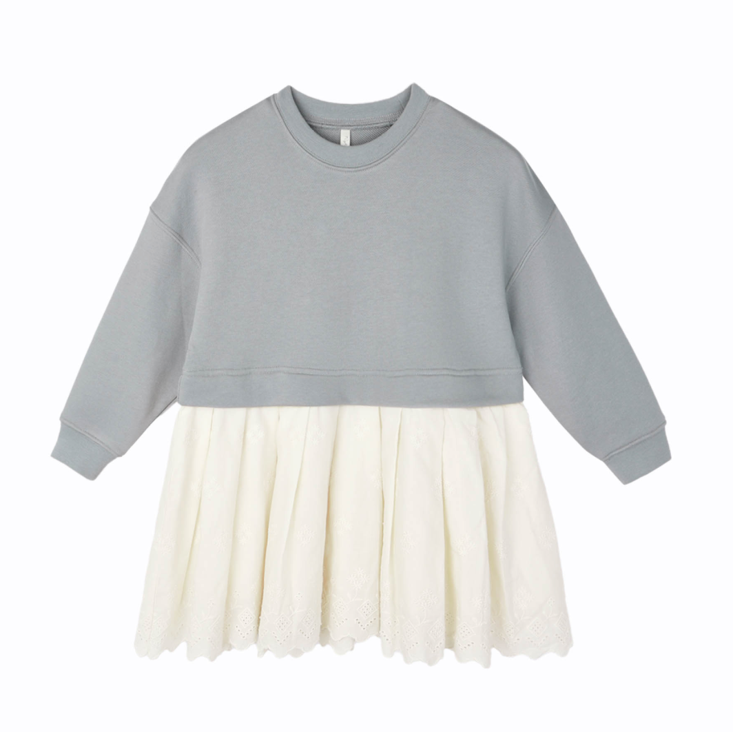 Stay warm in style with our Sweatshirt Dress, featuring a soft sweatshirt top and a pleated skirt with a sweet scalloped hem.