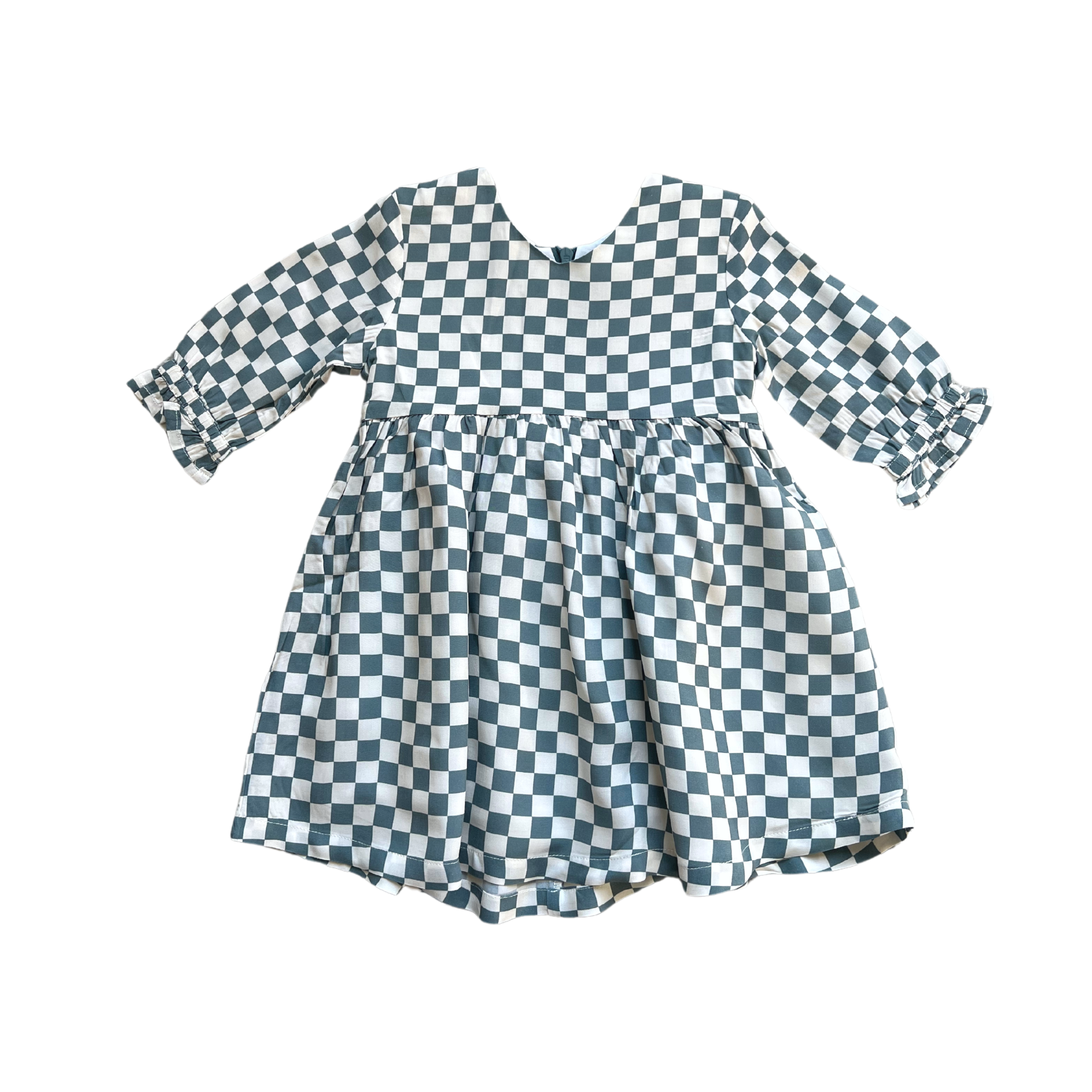 Our Girl's Woven Dress features an elbow-length sleeve with an elastic finish, and a flowy body in our Checkered print. Made with our premium bamboo woven fabric. Designed in the US | All colors and designs are exclusive to Babysprouts Clothing Co