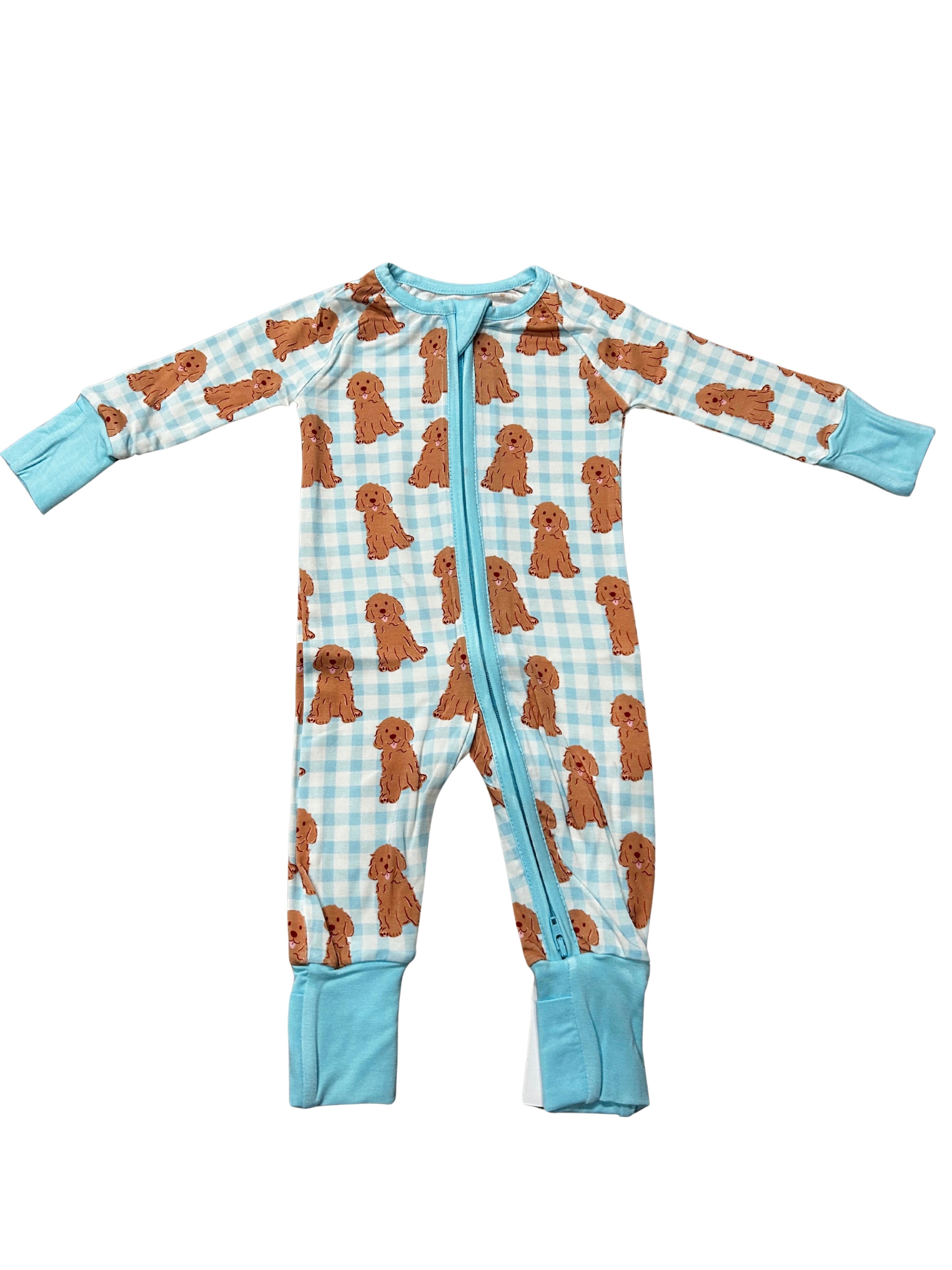 Adorable blue romper featuring an adorable goldendoodle design that'll have everyone smiling. The convenient front zipper makes diaper changes and dressing a breeze, while soft, breathable fabric keeps little ones comfy all day long. Perfect for playdates, photos, or just snuggling at home. This charming one-piece is a must-have for any goldendoodle-loving family!