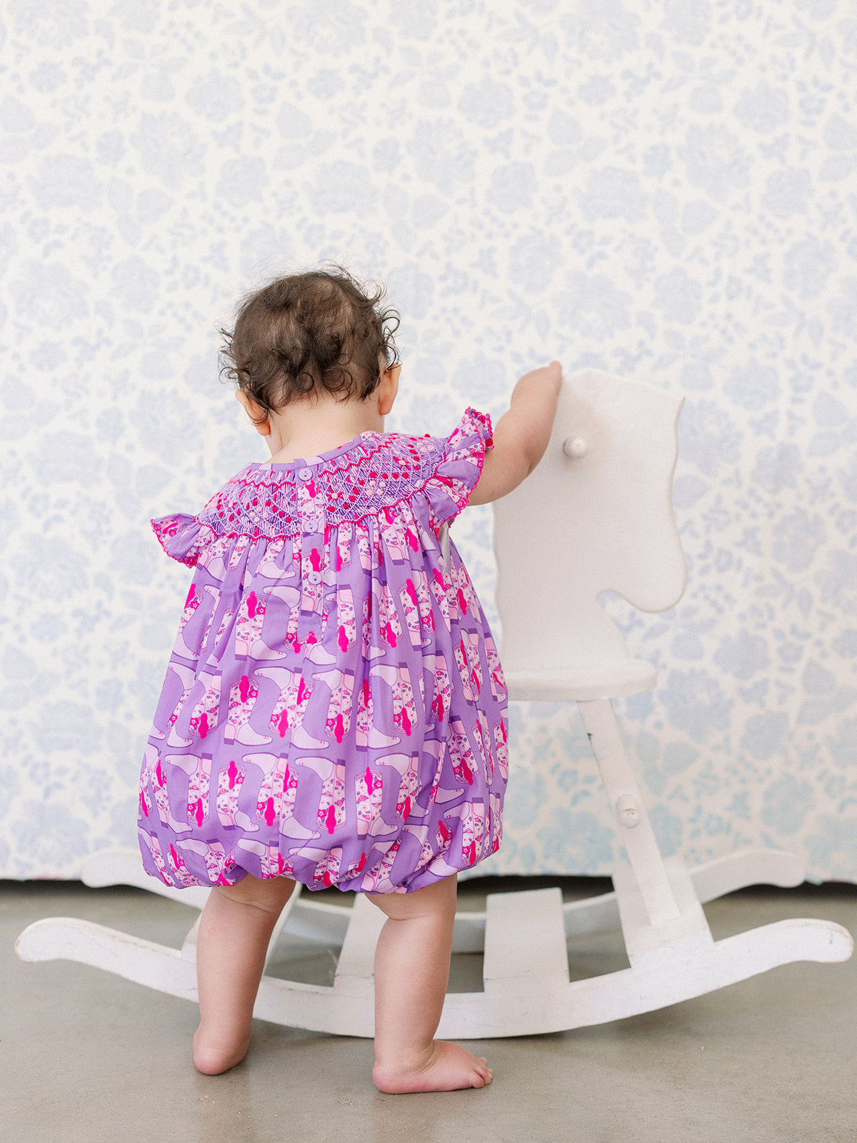 Sparkle and bounce in this adorable Glitzy Boots Bubble Romper! Designed for little fashionistas, this playful one-piece features a fun bubble silhouette with eye-catching glittery boot details that'll have her twirling all day long. The soft, comfortable fabric keeps her cozy while the charming design makes diaper changes a breeze. Perfect for playdates, celebrations, or just adding some shimmer to everyday adventures. Watch her shine!