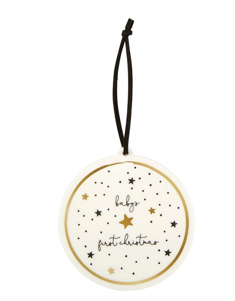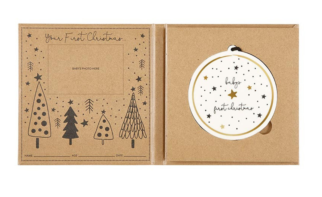 Remember every moment of baby's first Christmas with this keepsake ceramic ornament! Black and gold metallic design on ceramic round disk with black suede loop. Inside cover of keepsake box holds baby's picture, name, age, and date.