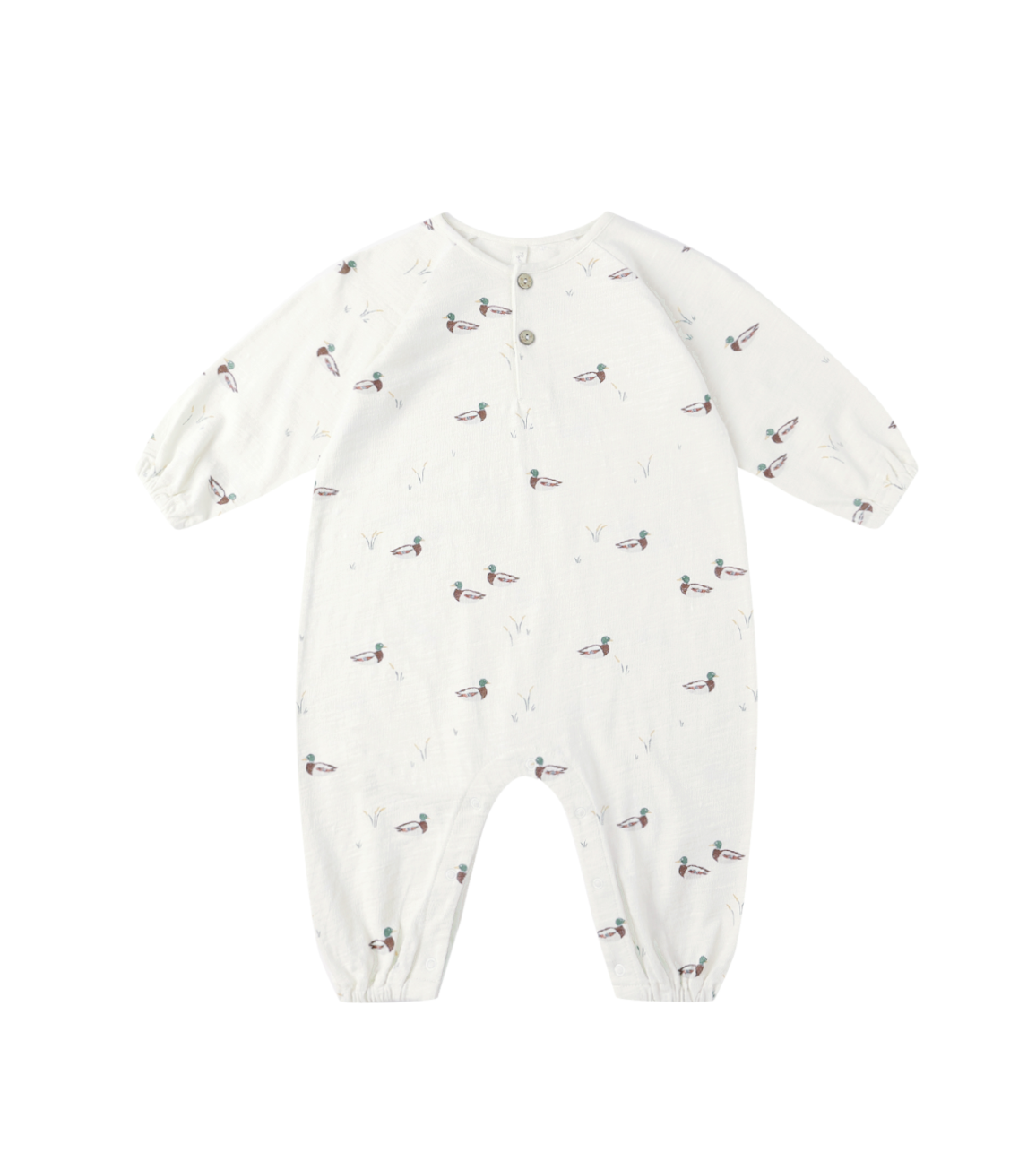 Our Henley Jumpsuit features a bubble silhouette with elasticized wrist and ankle openings, a two-button front placket, and bottom snaps for easy changes.