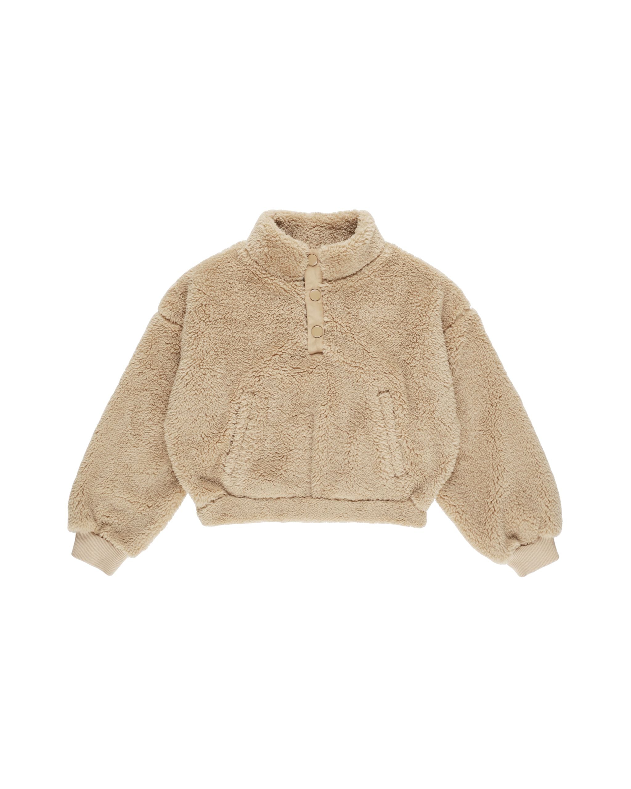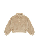 Fuzzy quarter zip pullover featuring snap button placket at the front and functional pockets as well.