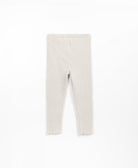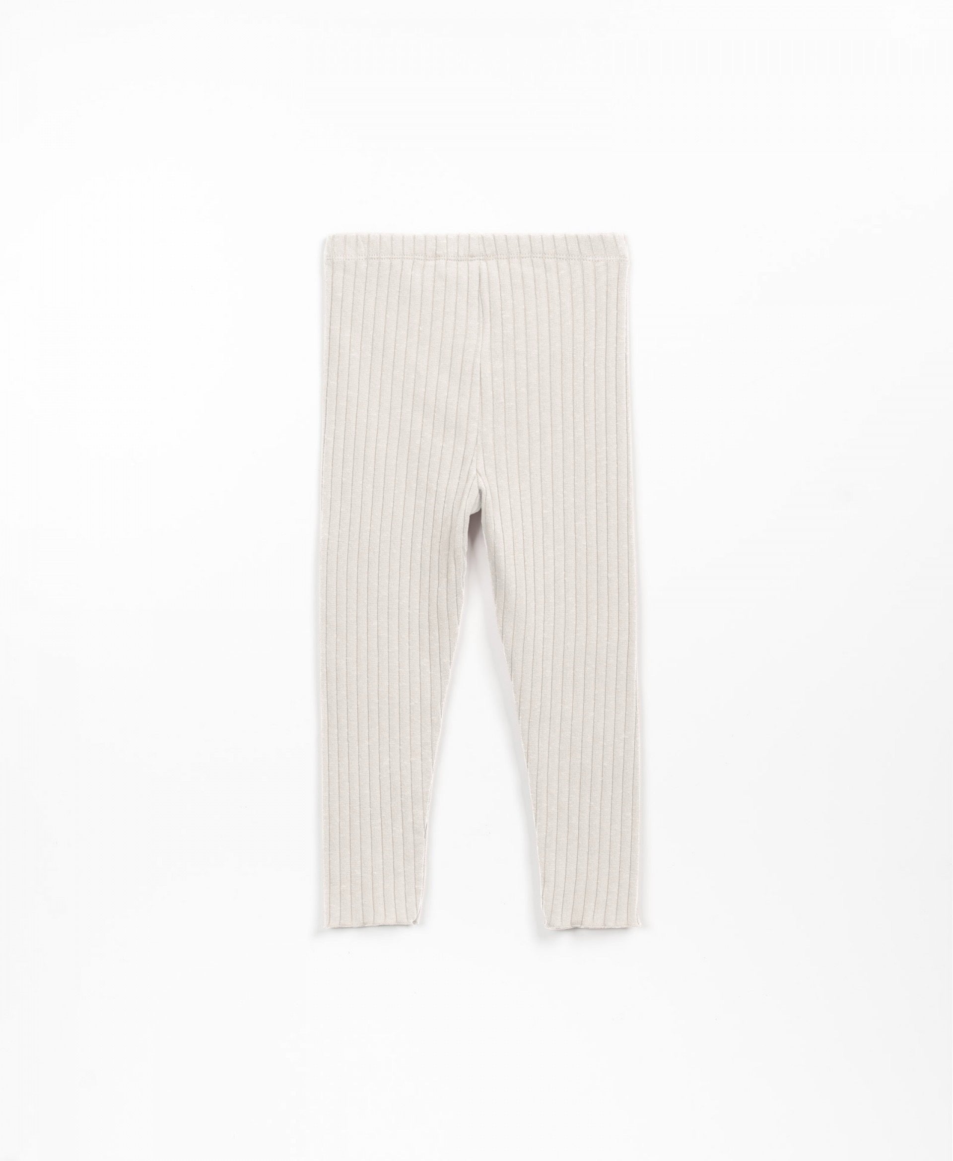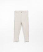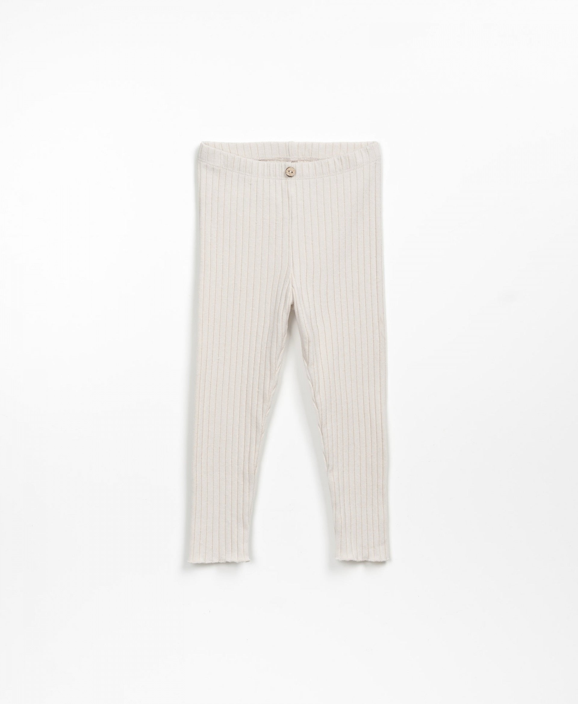 These ribbed leggings are made from a mixture of recycled fibers, cotton and polyester, So-So color. The model has an elastic waist and a decorative coconut button.
