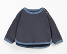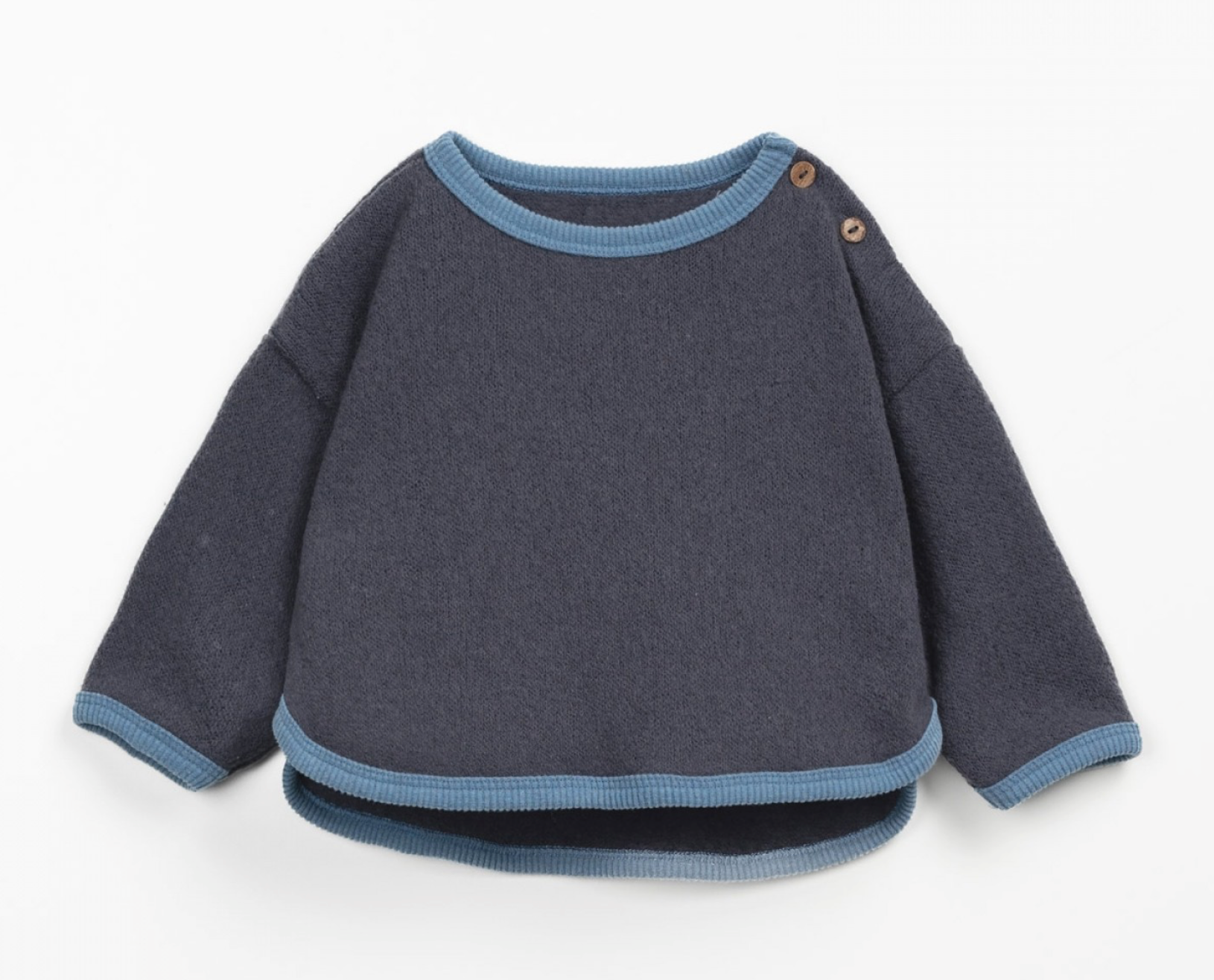 This jersey sweater is made from a mixture of recycled fibers, Shadow color, and contains 33% of our Re(Play) recycled yarn. The model has a round neckline and long sleeves, with a contrasting color detail and an opening on the shoulder with coconut buttons.