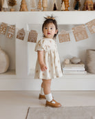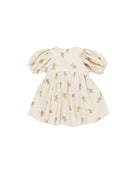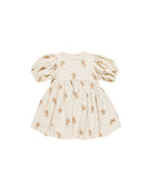 Our Babydoll Dress Set features an empire waist dress with balloon sleeves and a coconut button keyhole. It also includes matching baby bloomers.