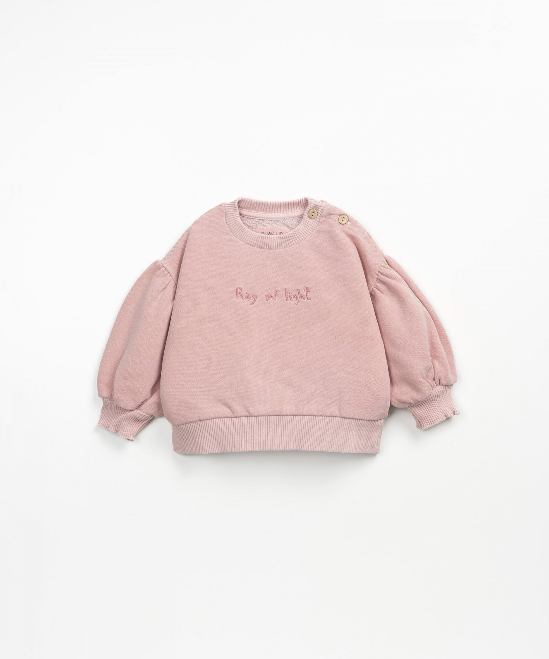 This jersey sweater is made from a mixture of organic cotton and cotton, Memories color. The model has a round neckline, elastic cuffs and hem and a phrase on the front.